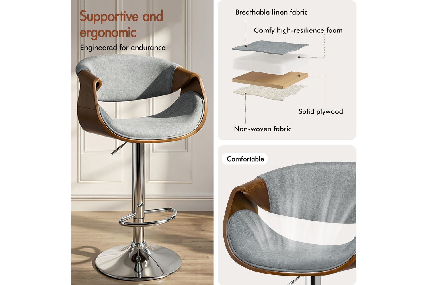 Crafted with a unique mix of solid bentwood, durable steel, and soft linen fabric, the Alfordson bar stool is built to complement a wide range of kitchen and dining interiors. The elegant wooden seat, finished with a delicate wood grain, is paired with a plush grey linen cushion and backrest, both generously padded with high-resilience foam for superior comfort and support. The ergonomic design contours perfectly to your body, making it ideal for long chats or quick meals at the counter.
