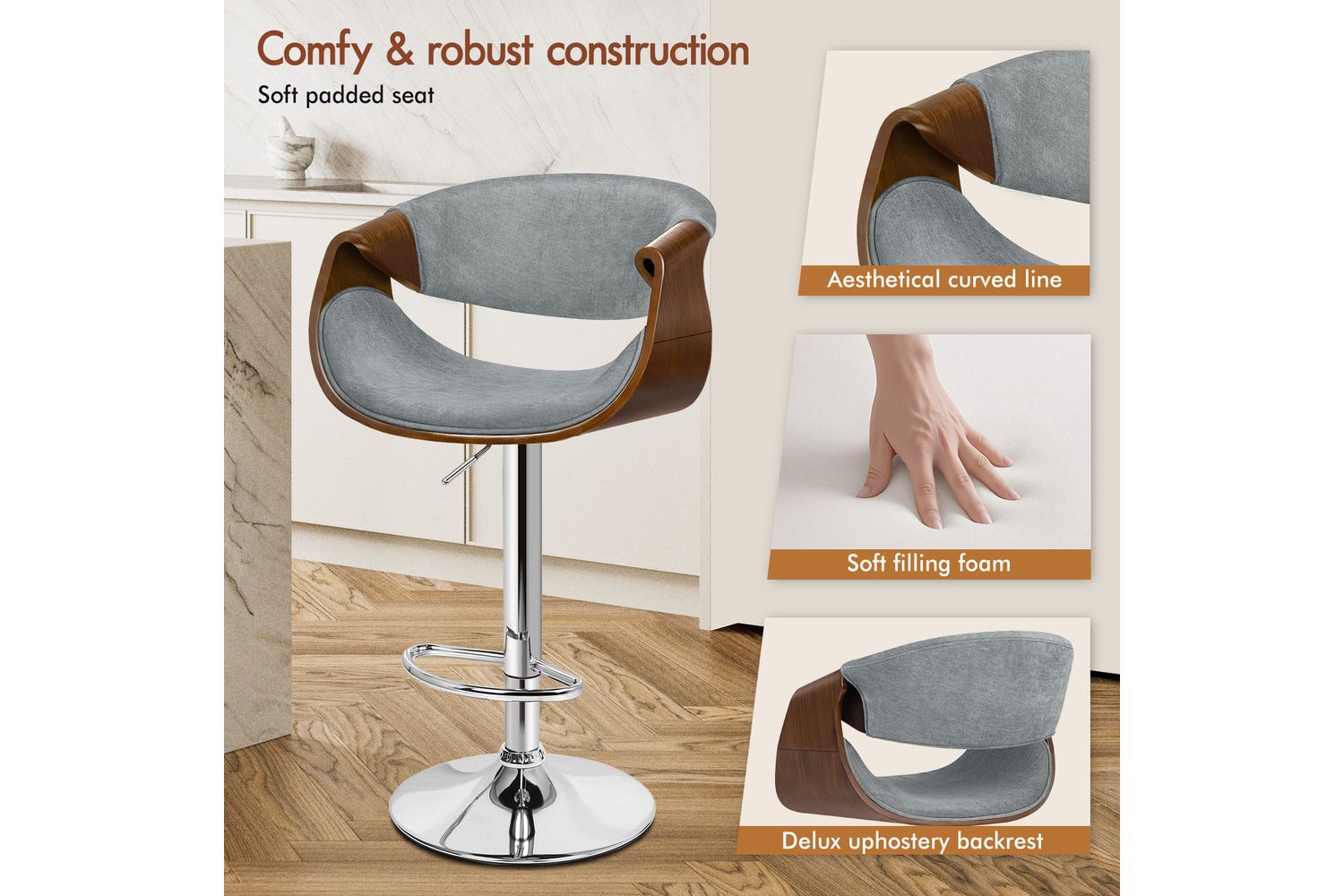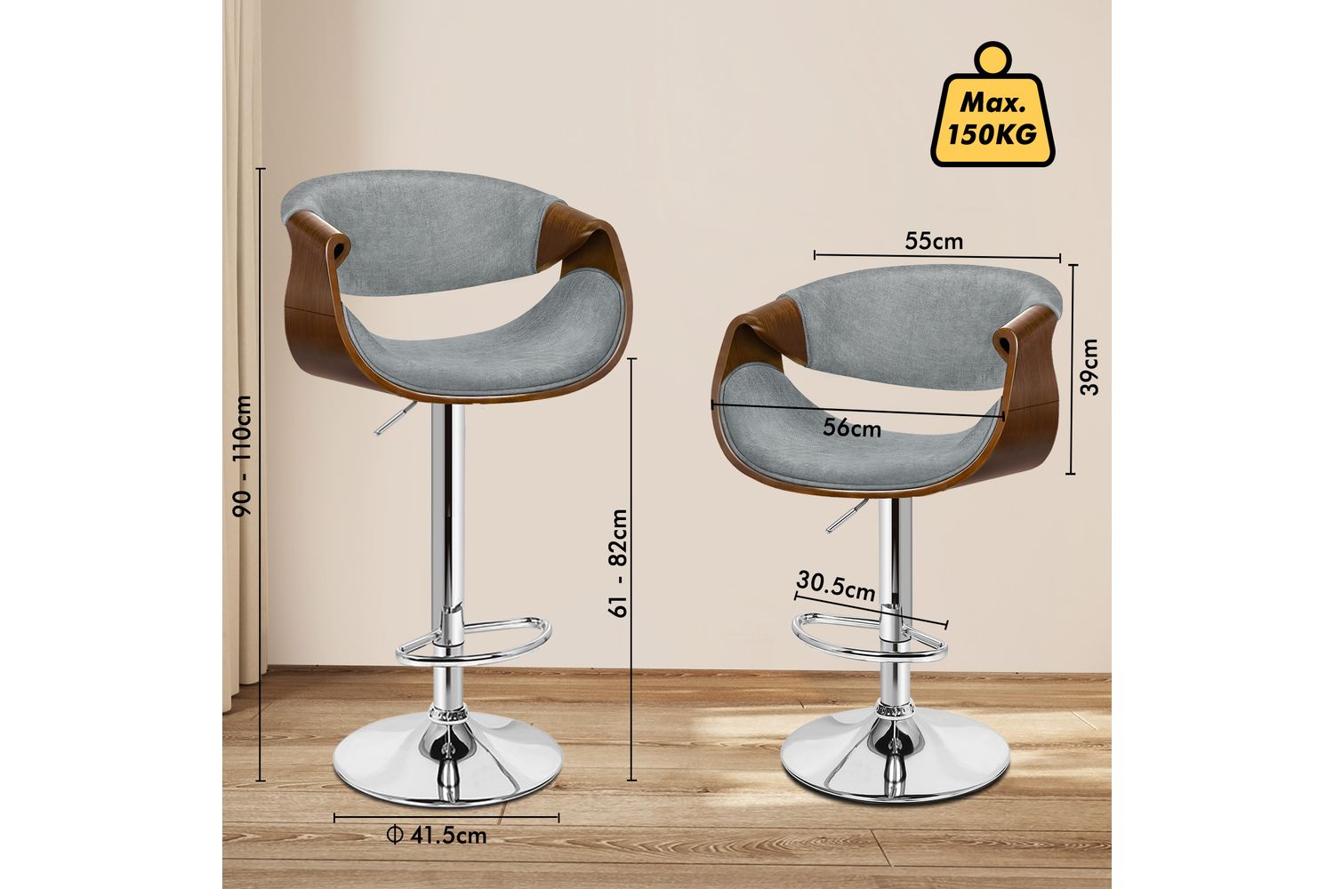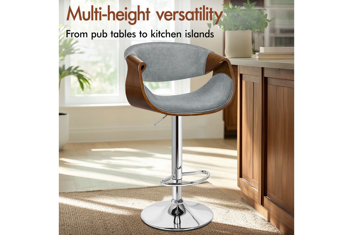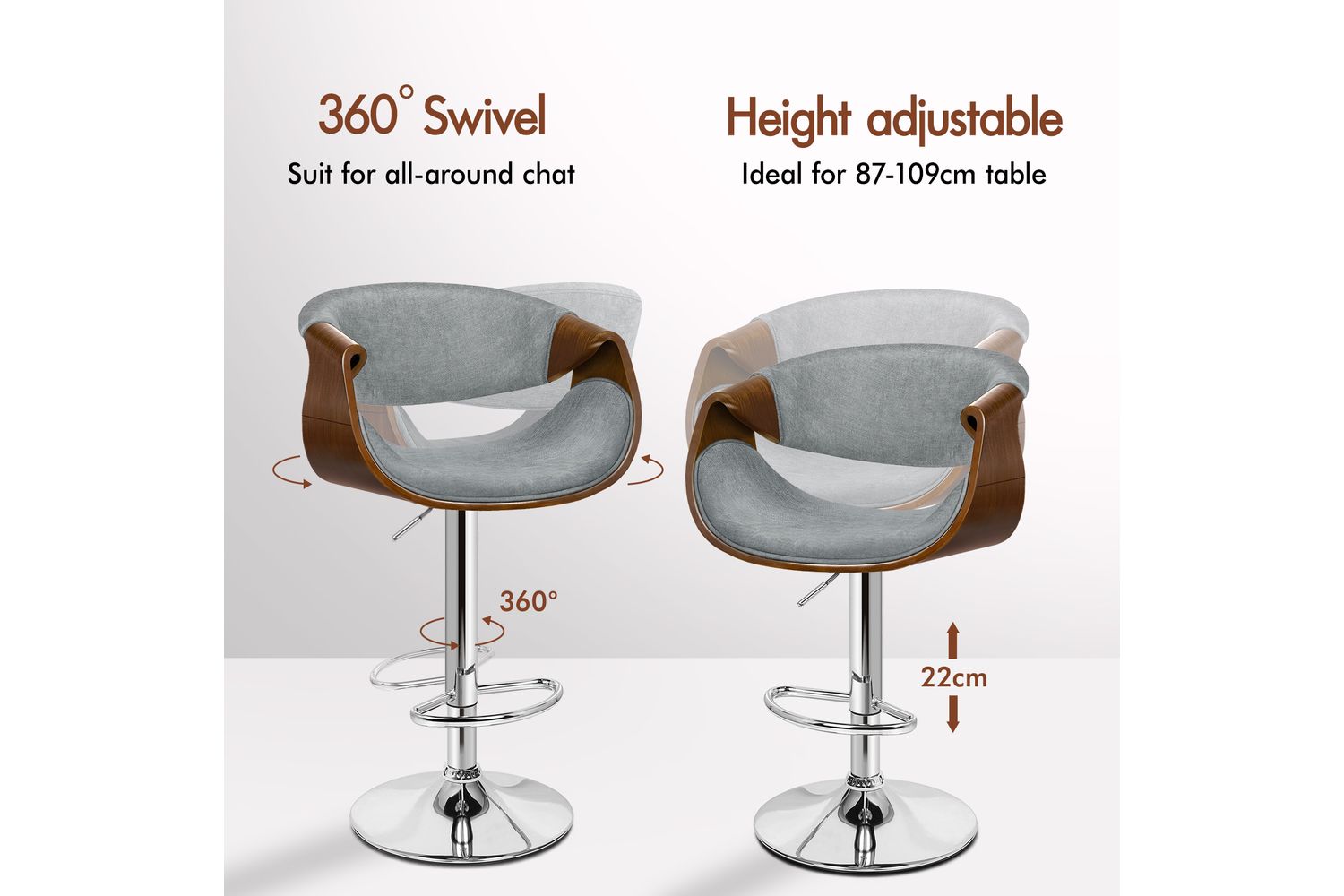 Functionality is at the heart of this bar stool. The smooth 360-degree swivel and easy height adjustment, powered by an SGS-approved gas lift, allow you to tailor your seating experience to any counter or island height. The sturdy chrome base not only adds a touch of modern shine but also ensures stability and durability, supporting up to 150kg. A curved footrest provides a comfortable spot to rest your feet, while the integrated rubber floor protector ring keeps your floors safe from scratches and noise.