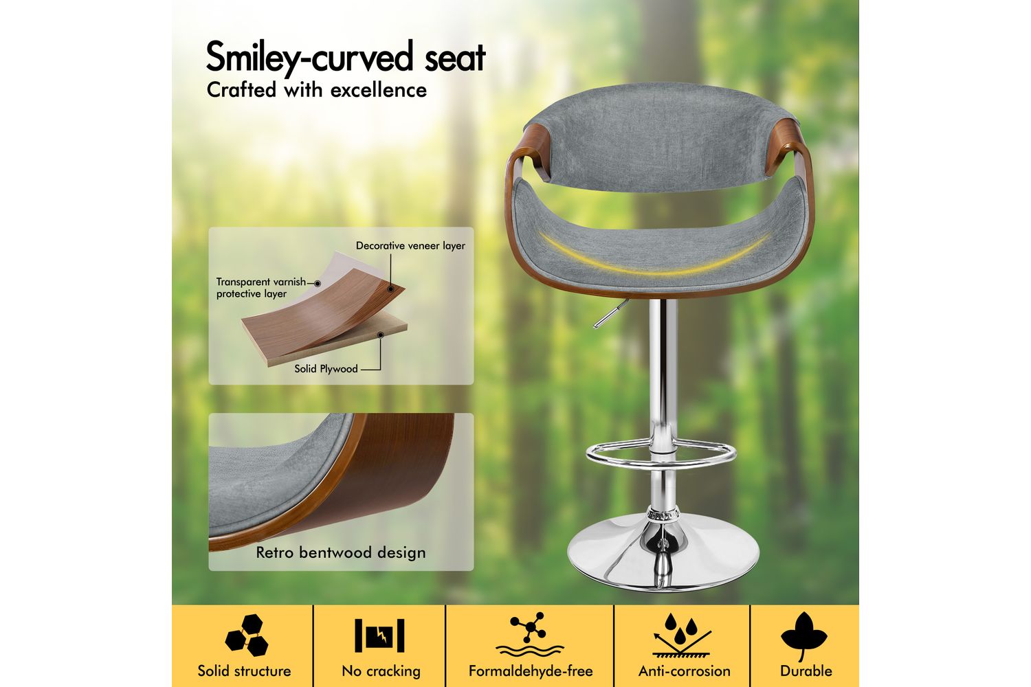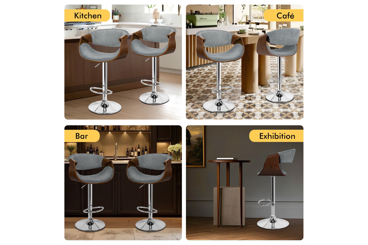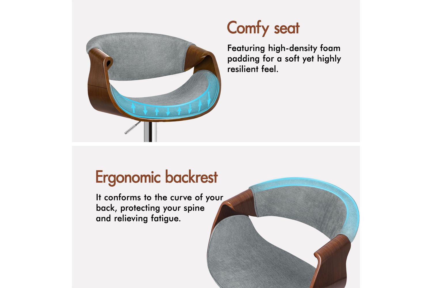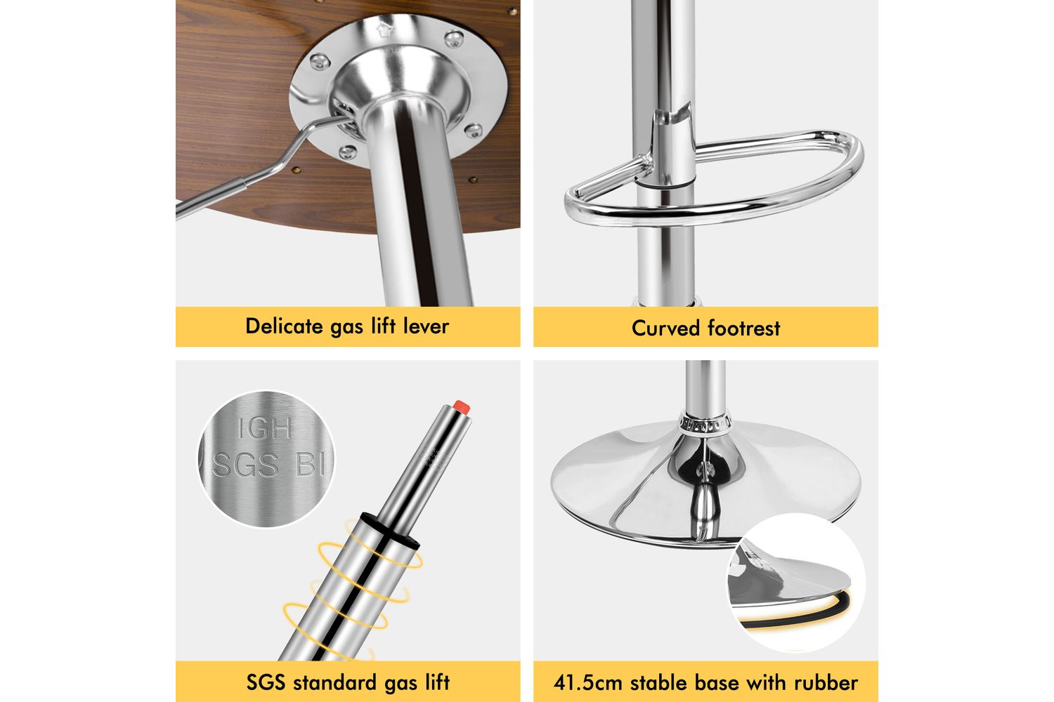 Functionality is at the heart of this bar stool. The smooth 360-degree swivel and easy height adjustment, powered by an SGS-approved gas lift, allow you to tailor your seating experience to any counter or island height. The sturdy chrome base not only adds a touch of modern shine but also ensures stability and durability, supporting up to 150kg. A curved footrest provides a comfortable spot to rest your feet, while the integrated rubber floor protector ring keeps your floors safe from scratches and noise.