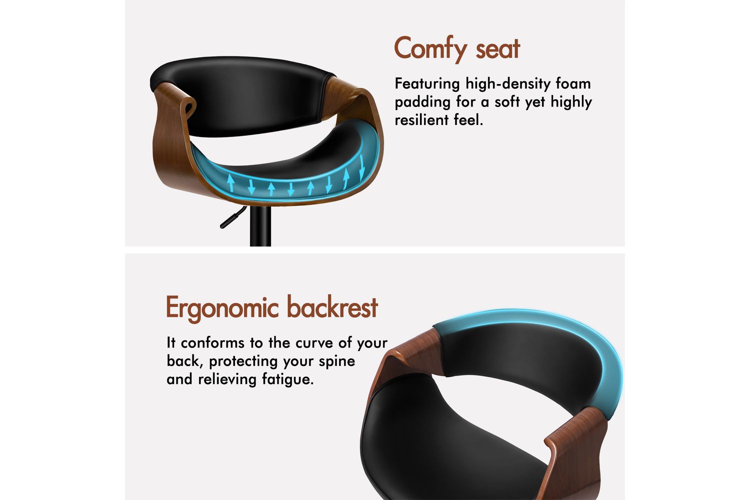 Crafted with a unique mix of solid bent wood, premium PU leather, and a robust steel base, the Alfordson bar stool is built to last. The generously padded seat and backrest, upholstered in high-quality PU leather, offer exceptional comfort and support, thanks to high-resilience foam that contours perfectly to your body. The 360-degree swivel and easy height adjustment allow you to tailor your seating position, making it ideal for kitchen counters, islands, or home bars of varying heights.