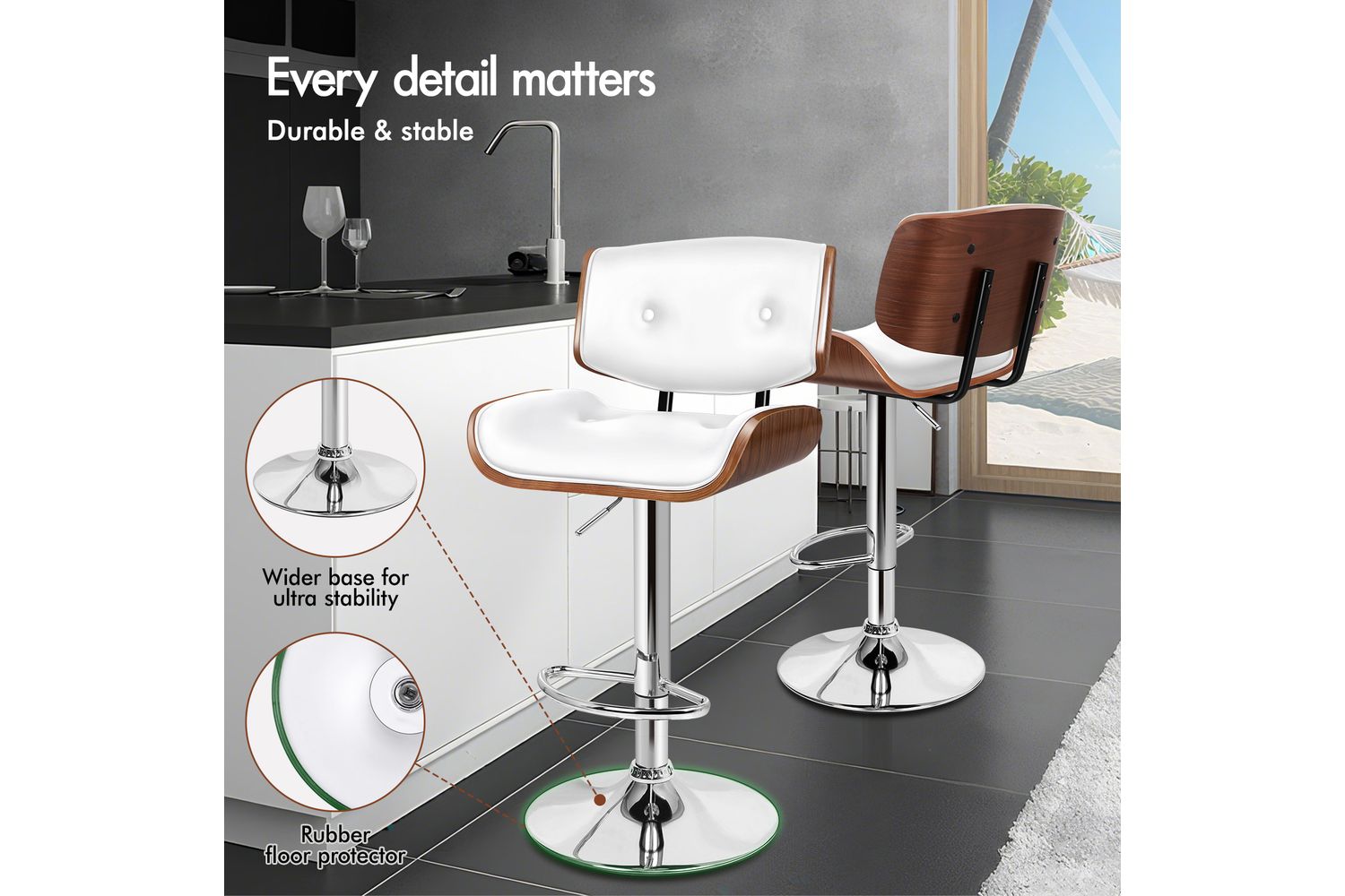 Designed with ergonomics in mind, the Alfordson Odette contours perfectly to your body, offering excellent support whether you are enjoying a quick snack or working from your kitchen counter. The smooth 360-degree swivel and easy-to-use gas lift lever allow you to adjust the height effortlessly, ensuring a perfect fit for any counter or bar. The curved footrest and wider base add extra stability and comfort, while the rubber floor protector keeps your floors safe from scratches and marks.