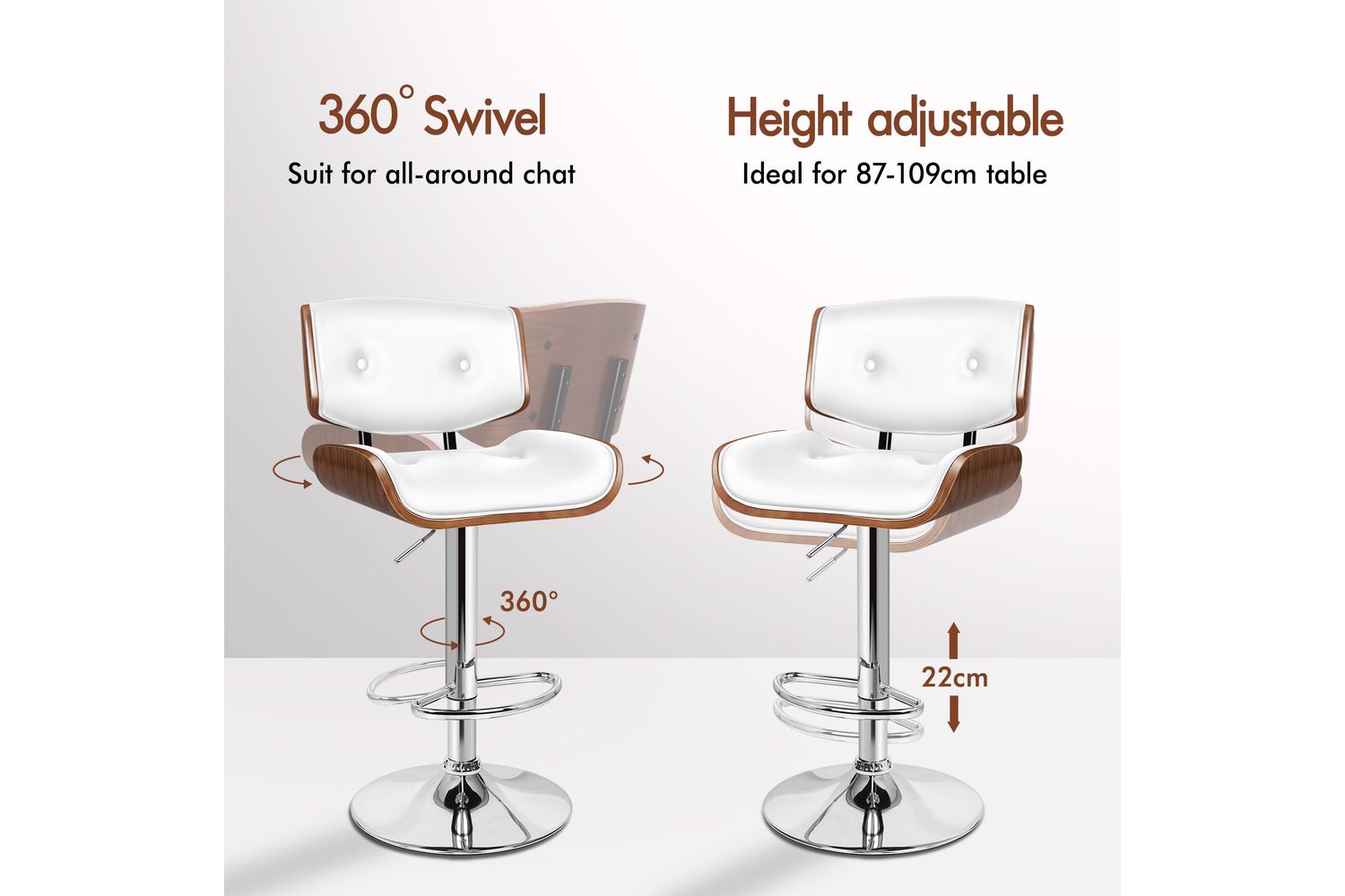 With its solid construction and high weight capacity, this bar stool is suitable for all members of the family, from kids doing their homework to adults unwinding after a long day. The contemporary design, combined with a delicate wood grain finish and black powder-coated chrome base, makes it a standout piece in any modern Irish home.