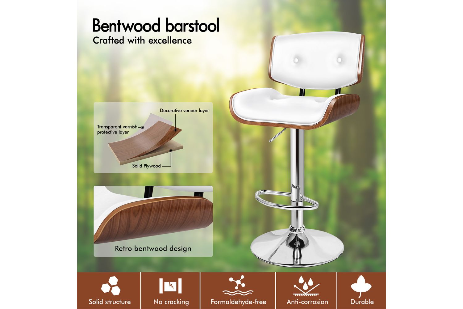 - Sturdy bent wood structure and robust steel base