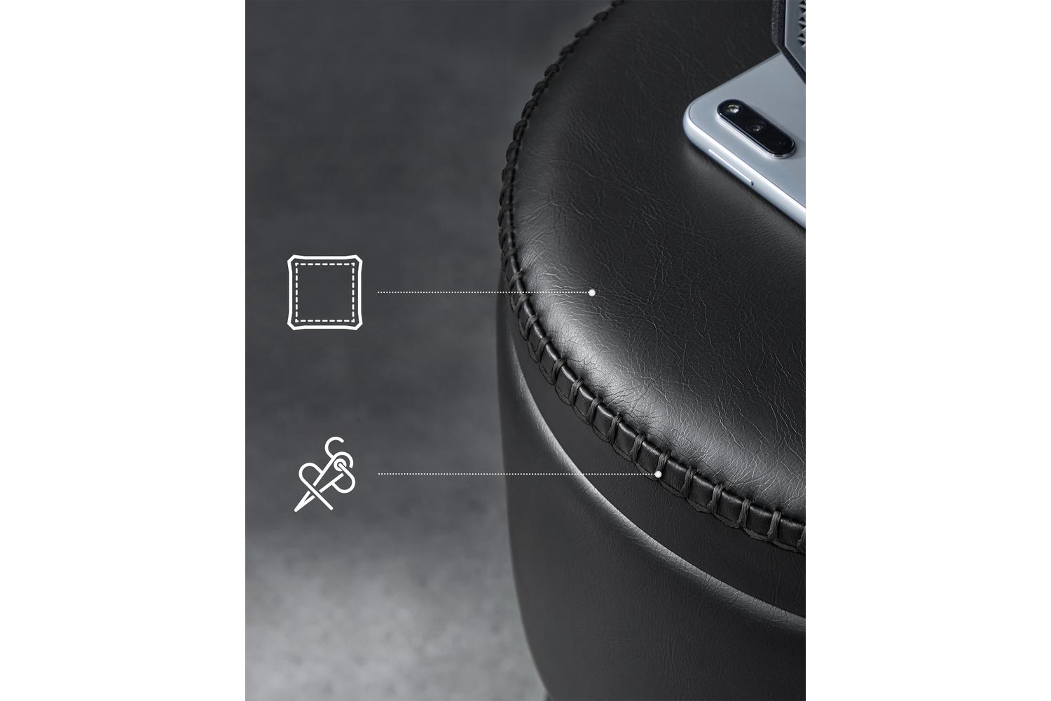 - Richly textured faux leather seat in ink black with fine stitching