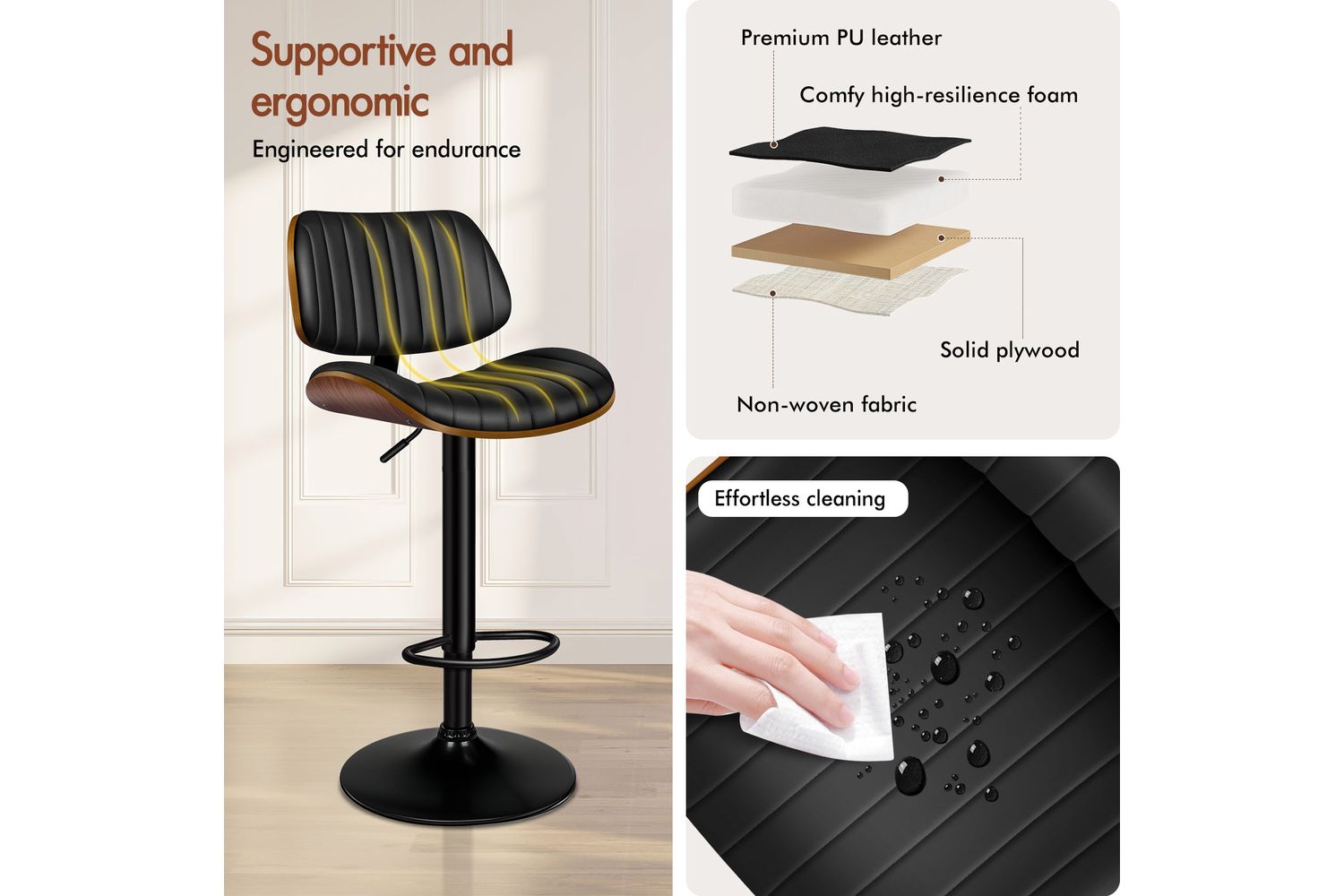- Seat Material: Solid plywood and PU leather