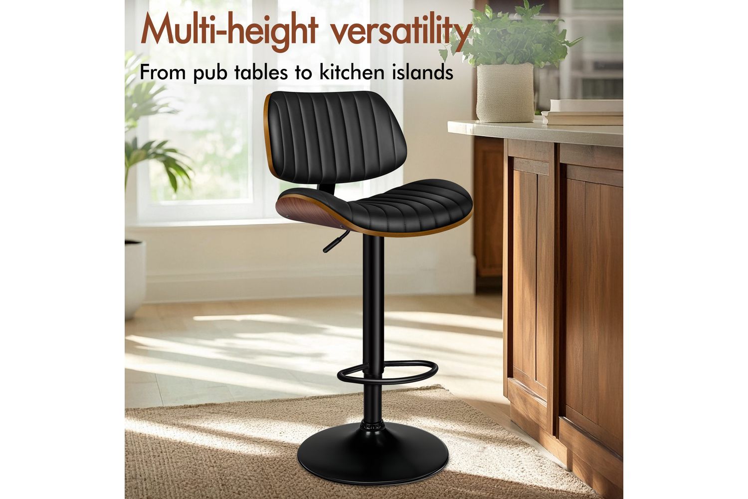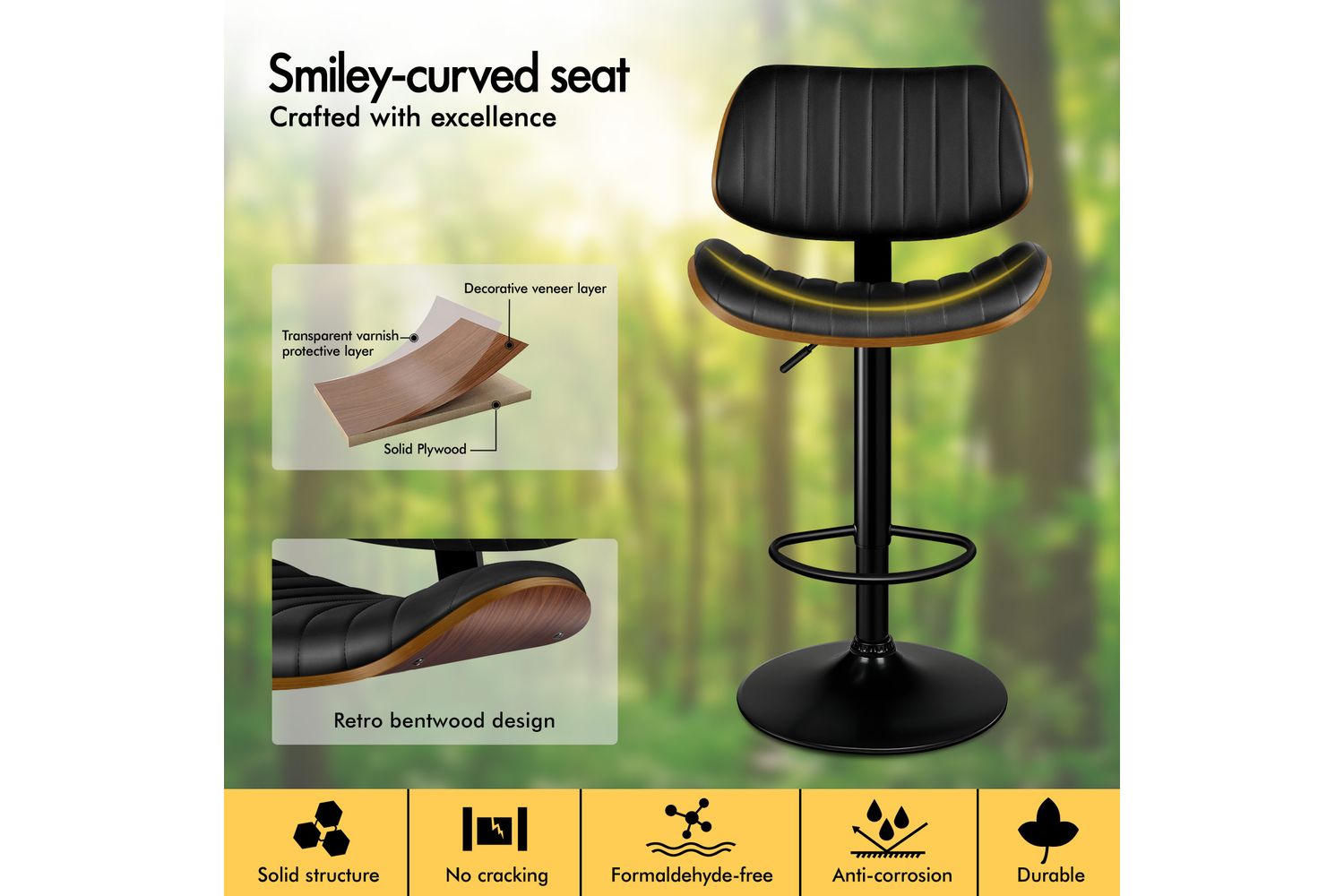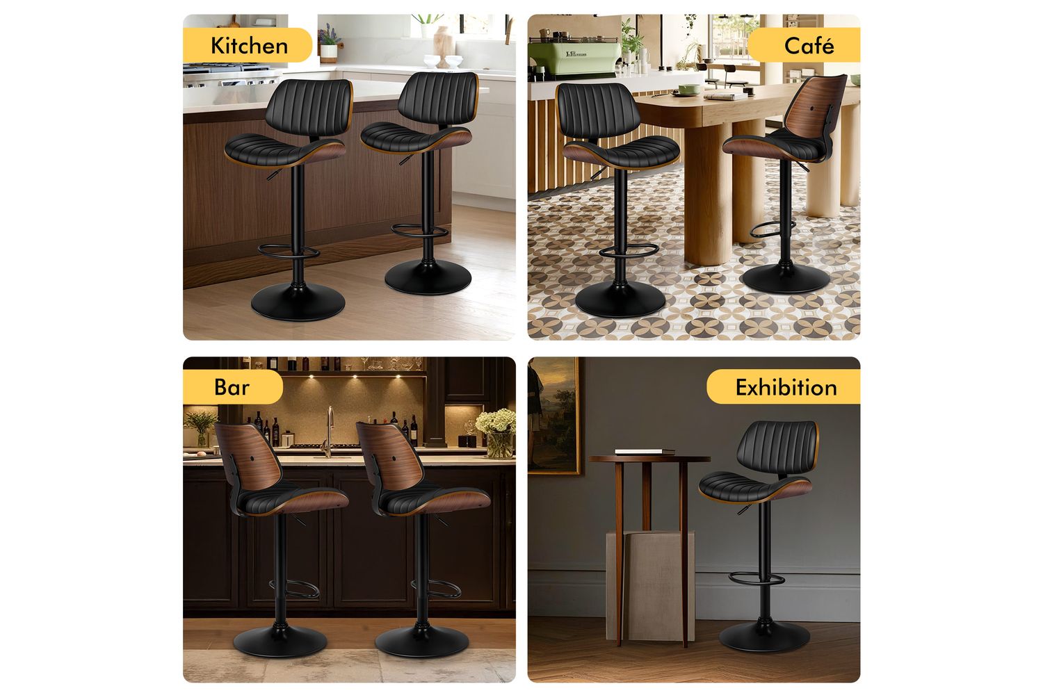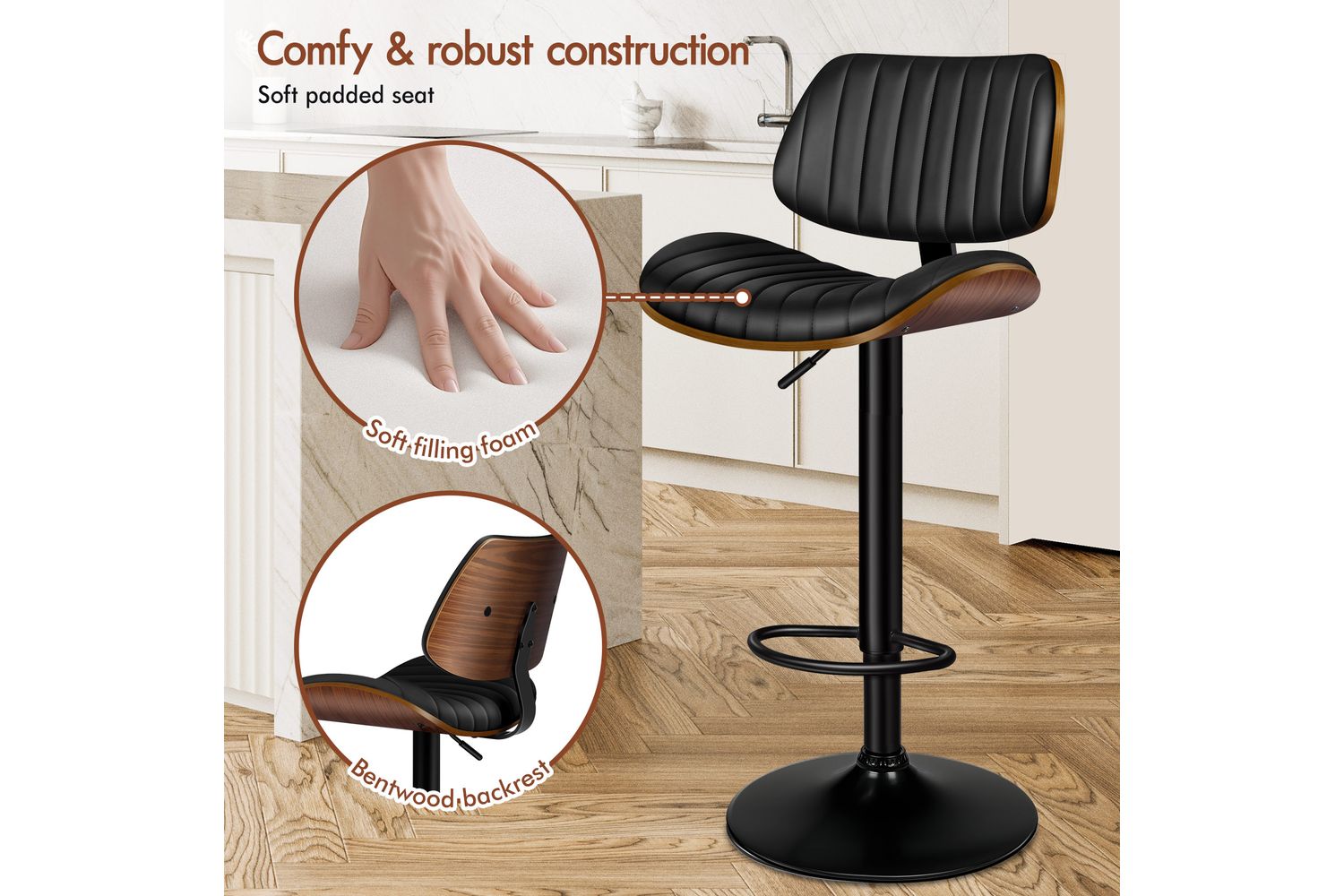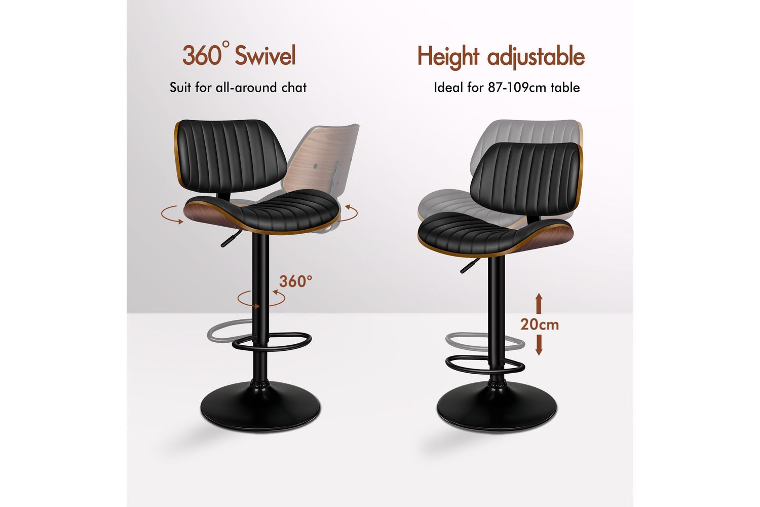 Alfordson Adjustable Swivel Bar Stool | Bentwood | PU Leather | Black | 150kg