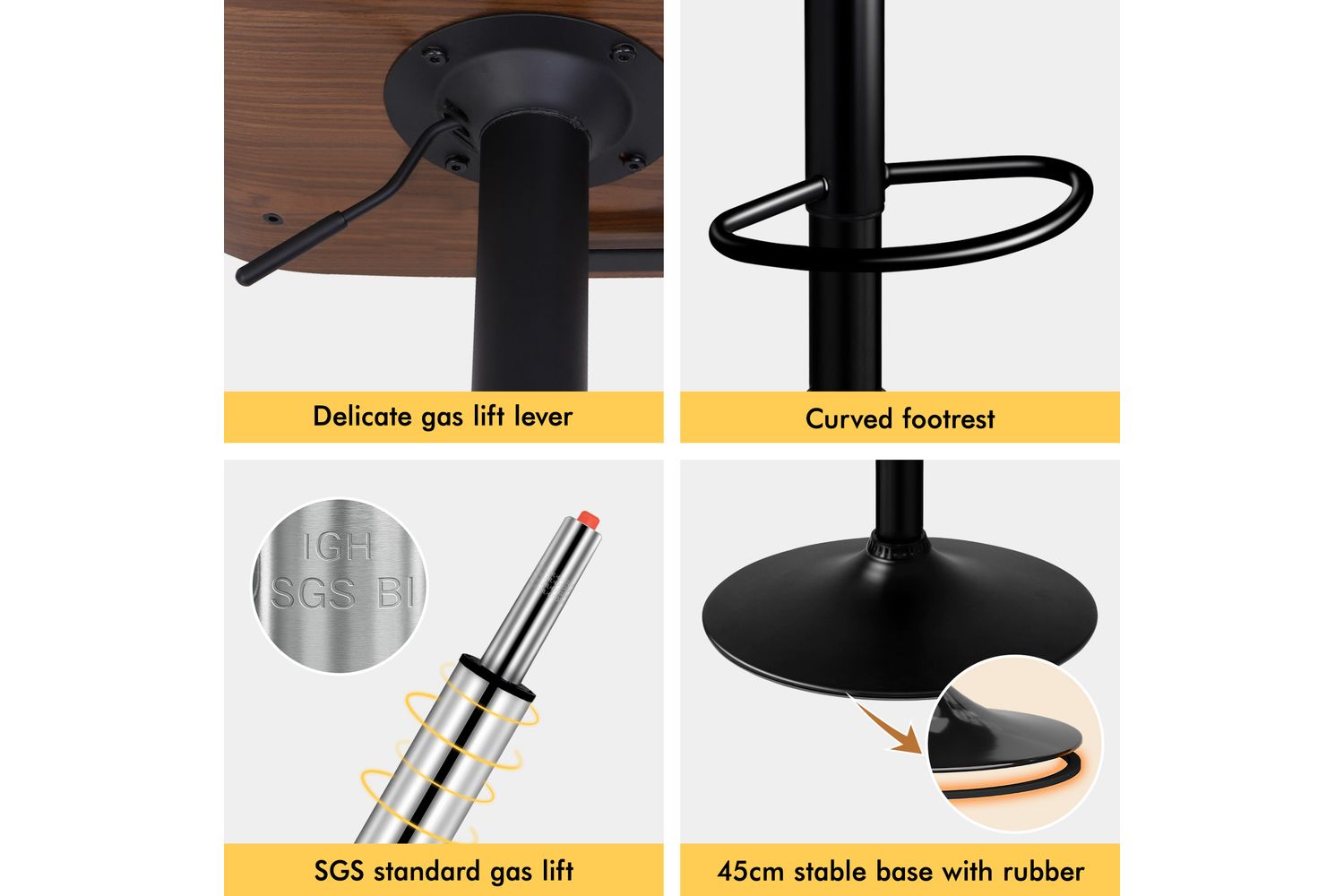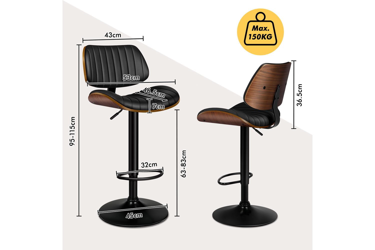 Functionality meets style with a smooth 360-degree swivel and easy gas-lift height adjustment, allowing you to customise your seating position for any occasion. The sturdy curved footrest provides extra comfort, while the wide, heavy-duty base ensures stability and peace of mind. With a high weight capacity of 150kg, this bar stool is as reliable as it is attractive.