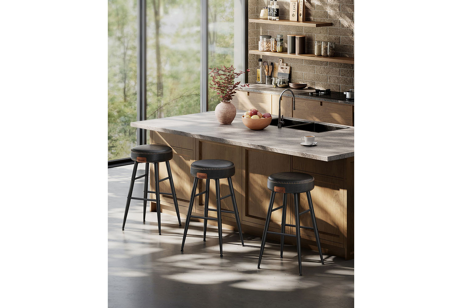 With splayed metal legs forming a rock-solid foundation, complemented by swivel leveling feet, these kitchen stools not only offer unwavering stability on uneven surfaces but also promise scratch-free contact