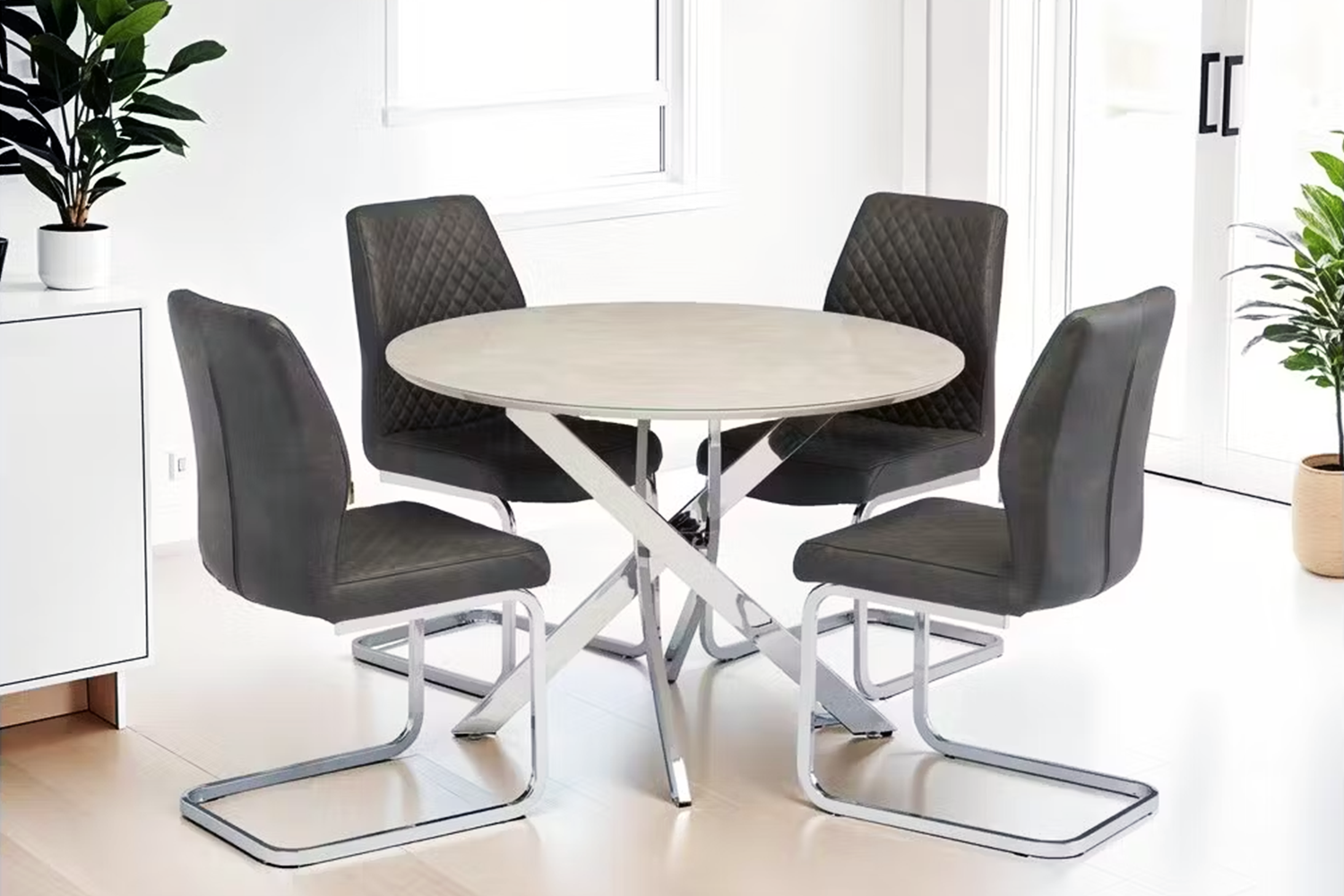 Meticulously crafted, the chairs feature a quilted Faux leather design evoking an air of exquisite taste. The exceptionally sleek grey tone augments their contemporary appeal whilst blending effortlessly with any home decor. The panelled Faux seams are uniquely patterned to enhance aesthetic appeal and offer a plush seating experience. Steeped in modern glamour, these chairs silently communicate your love for standout dining furniture.