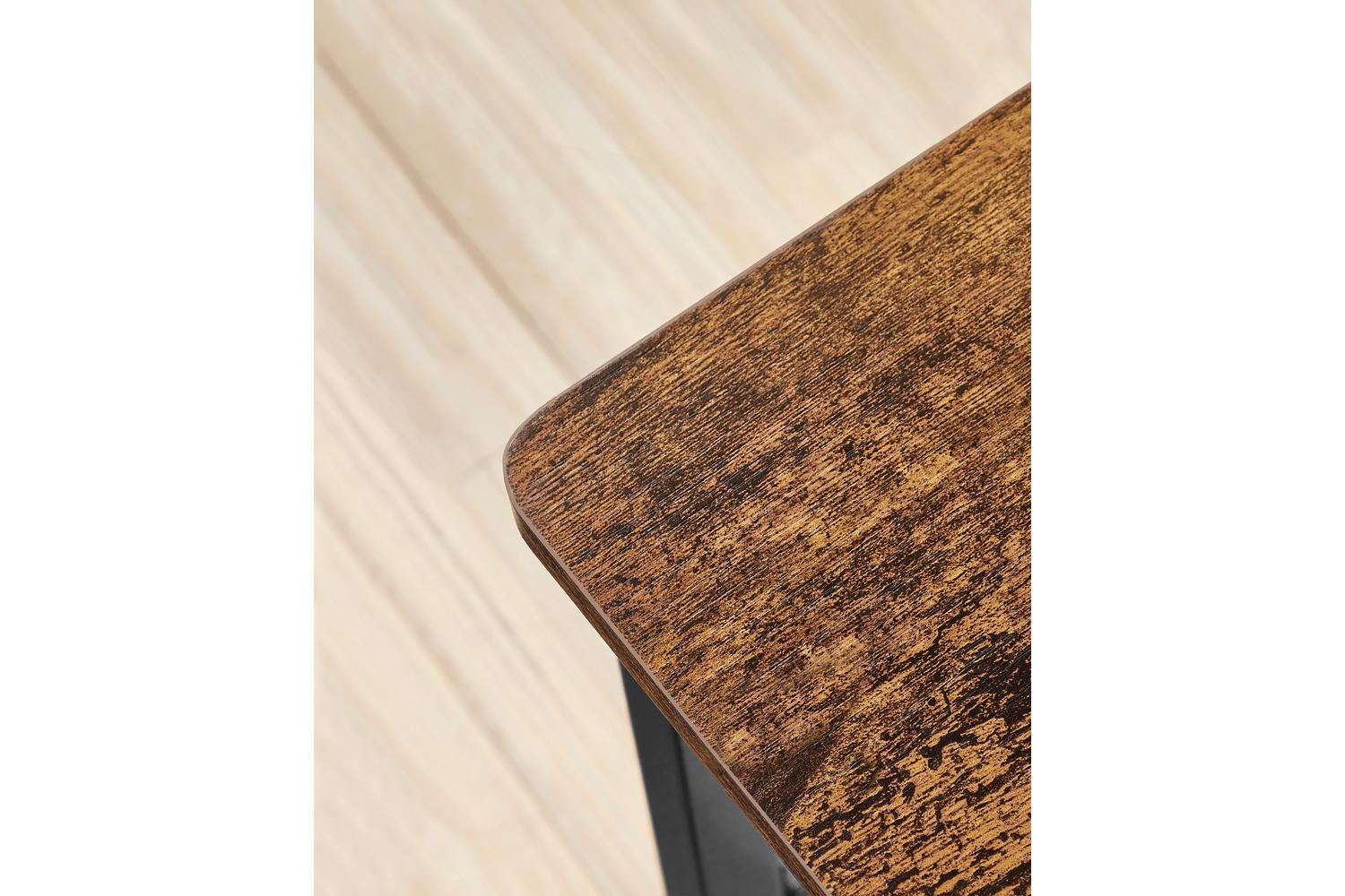 - Industrial-inspired design with black steel frame and rustic brown wood seat