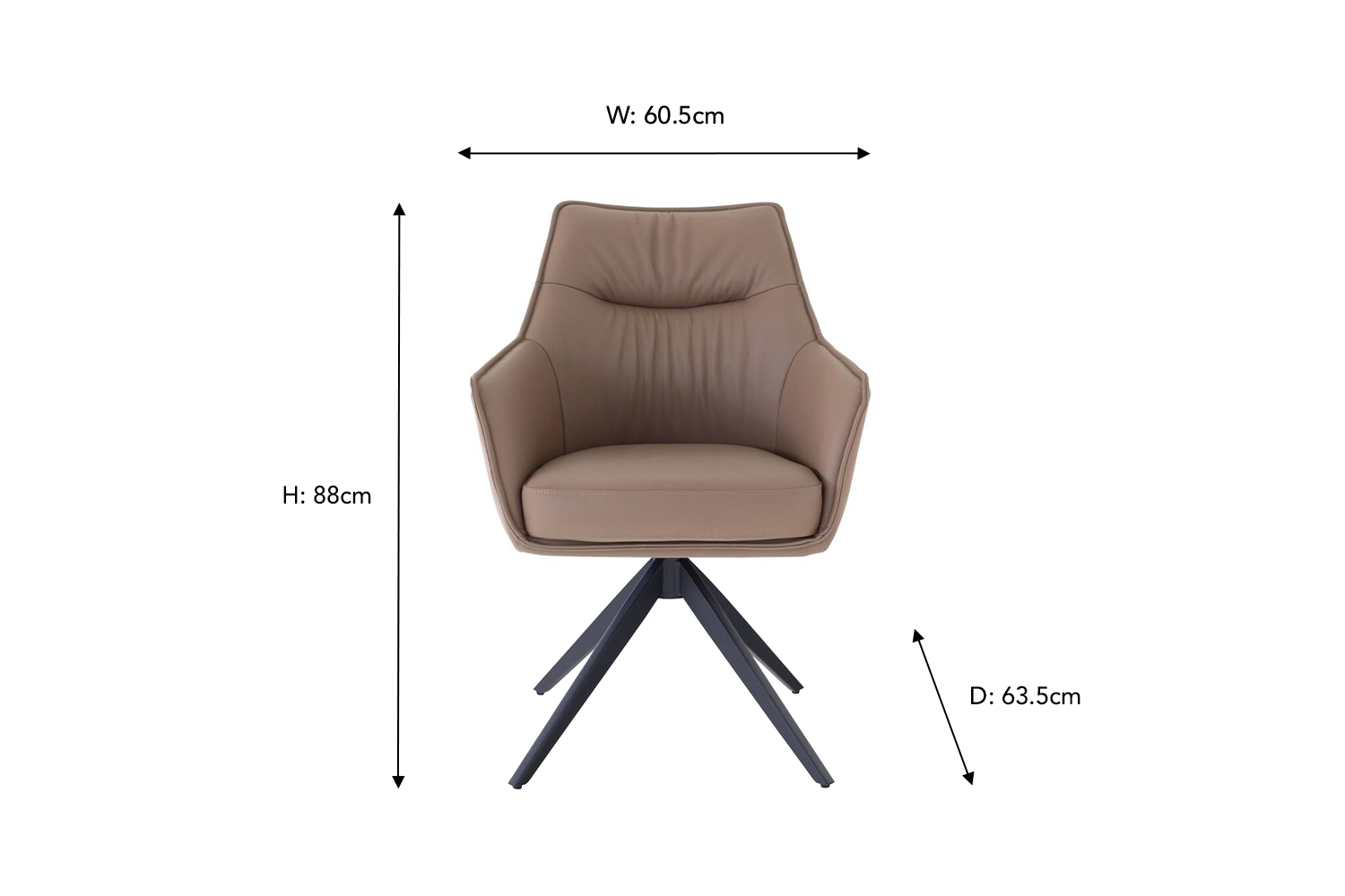 A stylish contemporary piece, the Kayleigh swivel chair would be a wonderful choice for your home and is perfect for both family meals and entertaining. With the ability to swivel a full 360 degrees, it offers both versatility and convenience, allowing you to effortlessly engage in conversation or reach for items around the table. The sleek black legs provide stability and a touch of sophistication, while the comfortable and stylish leather upholstery ensures a pleasant dining experience. Available in two incredible colours, perfect for any interior designs.