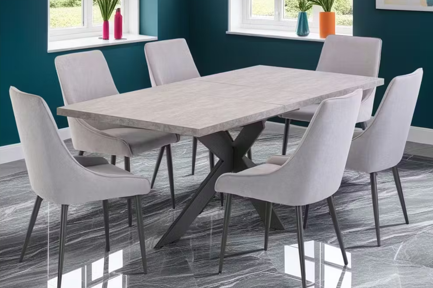 - Includes two dining chairs with grey powder-coated legs