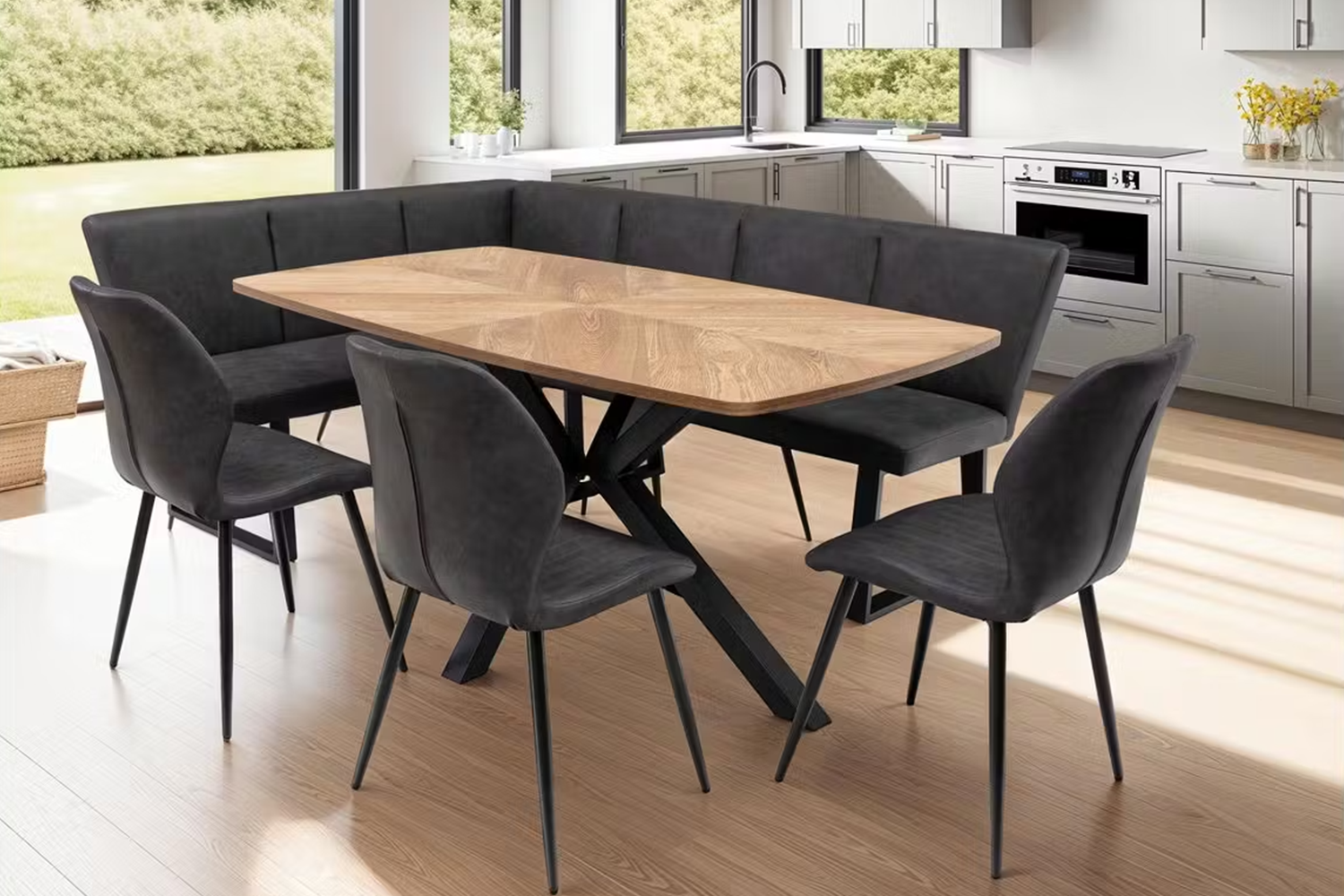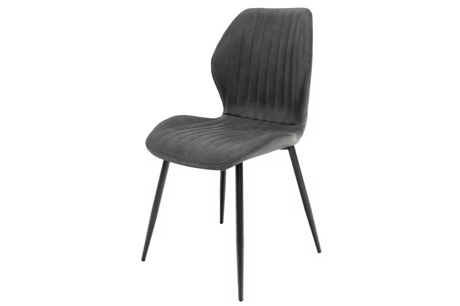 Beneath the charming exterior are sturdy black legs, coated in black powder, exhibiting an aesthetic balance between the grey upholstery.. They are more than just a beautiful feature - their robust construction ensures your seating is sturdy and long-lasting. Ensuring safety and floor protection, each chair is fitted with plastic floor protectors.