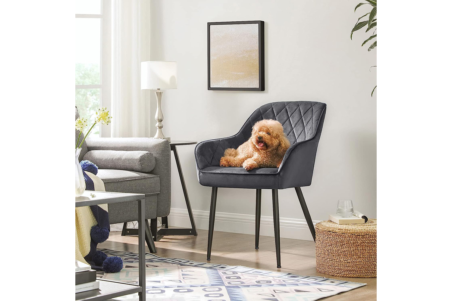 This padded chair is a decorative addition to your home. With soft lines, smooth velvet with diamond pattern and elegant metal legs, this chair will add a delicate touch to your home.