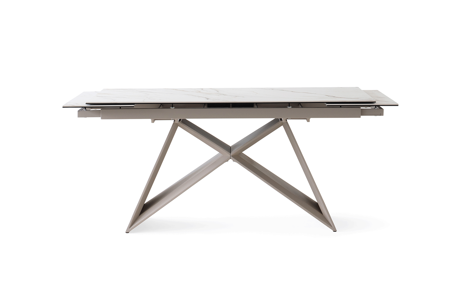 Prized for its exceptional durability and strength, the Milano Extending Dining Table is crafted from white and beige flower ceramic with black tempered glass. Its base features a unique triangular leg design in metal with beige powdered coating, further stealing the spotlight with its blend of style and efficiency. It’s finished with a gorgeous marble effect and complete with an extending mechanism allowing for more space at mealtimes and perfect for hosting dinner parties for guests.