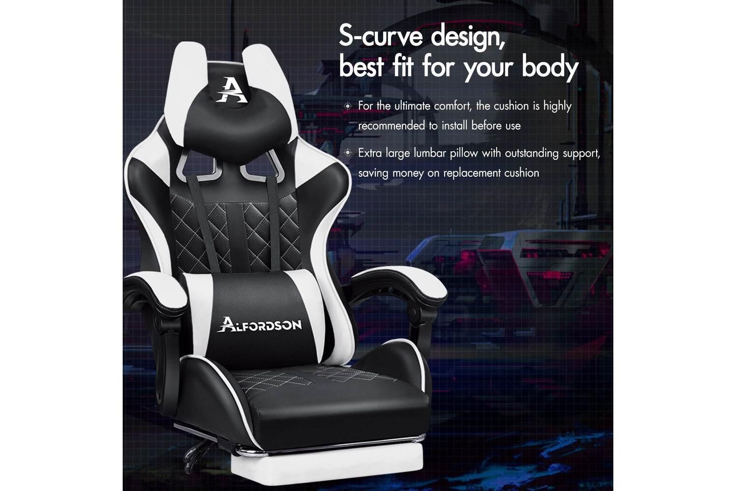 Engineered for performance, the Alfordson chair features a heavy-duty all-metal frame racer, ensuring long-lasting durability and stability. The S-curve design with a wider and taller backrest perfectly contours to your body, reducing back and shoulder pressure during extended sessions. The whole-piece moulding foam padding in the car-seat grade base seat offers exceptional comfort, while the triple-layer seat construction combines PU leather and resilience foam for a plush, supportive feel.