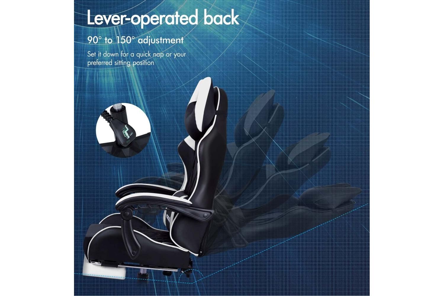Enjoy personalised comfort with up to 150-degree back recline adjustment, allowing you to find the ideal position for gaming, working, or even taking a quick nap. The removable, height-adjustable extra-large lumbar pillow and U-shape headrest provide targeted support, helping to maintain healthy posture and reduce fatigue. For ultimate relaxation, the retractable padded footrest is perfect for stretching out during breaks.