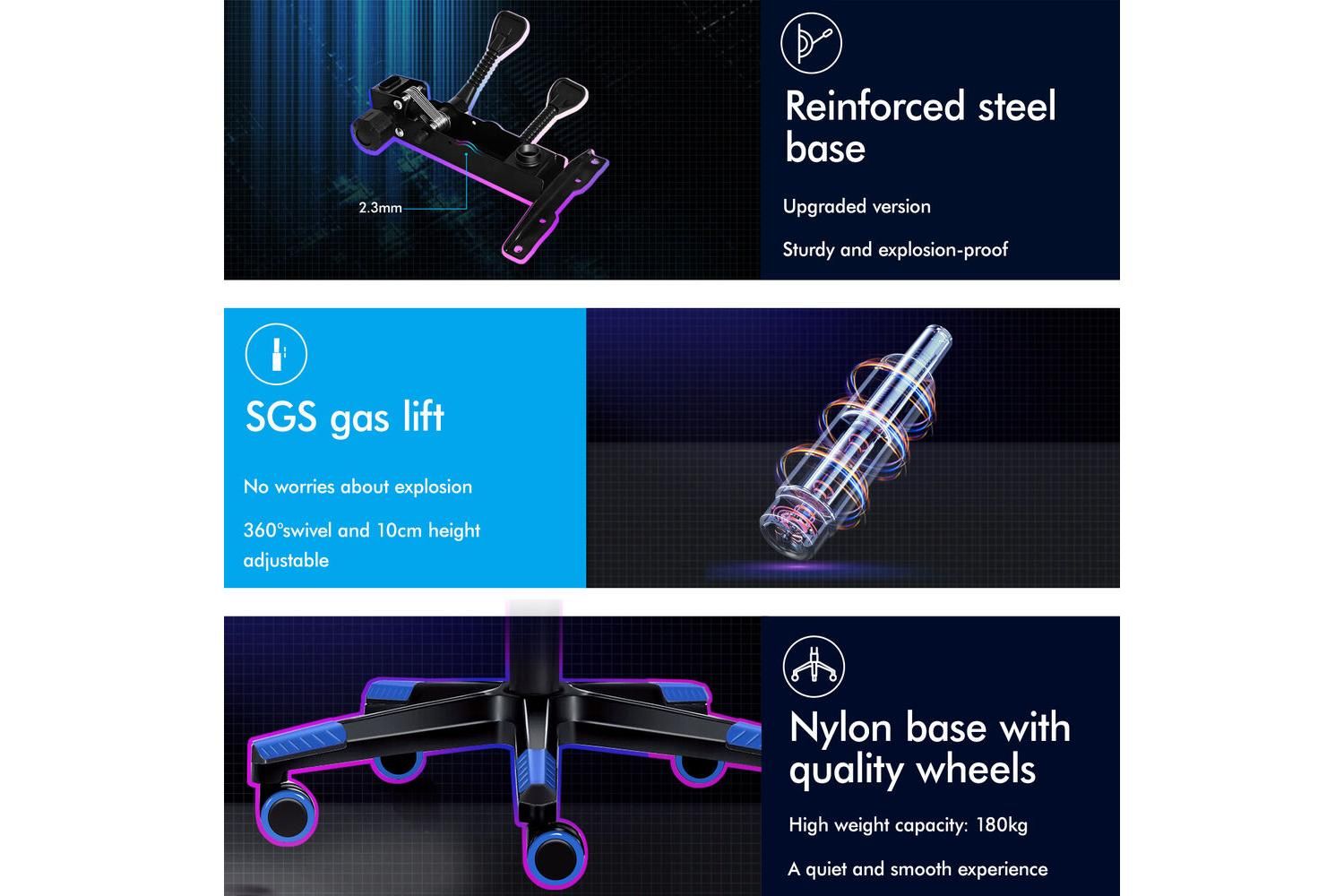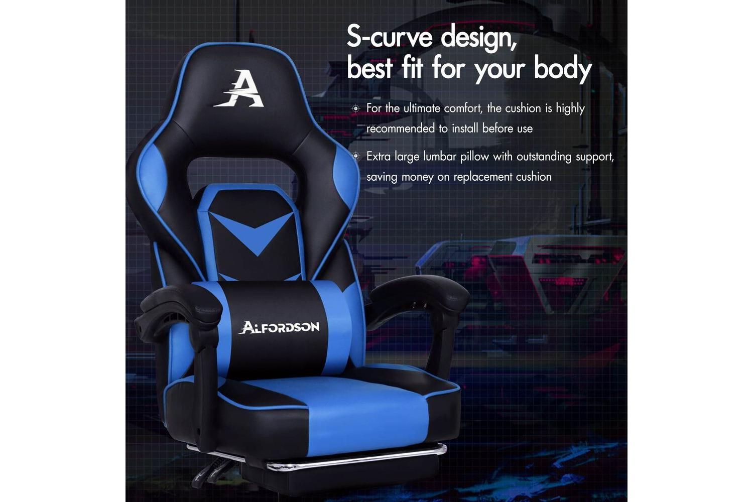 Engineered for long hours of use, the ALFORDSON Gaming Chair features an S-curve design that perfectly contours to your body, providing exceptional lumbar and shoulder support. The extra-large, removable lumbar cushion and retractable padded footrest ensure you stay comfortable during intense gaming sessions or extended workdays. With generous foam padding and a whole-piece moulding foam seat, you will enjoy superior weight distribution and lasting resilience.