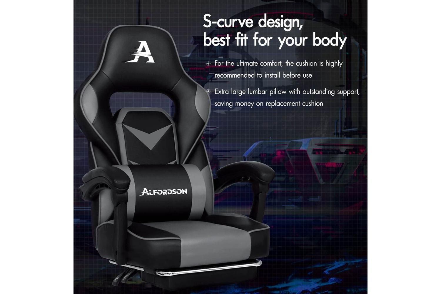 Engineered for long sessions, the Alfordson Gaming Chair features an S-curve design that perfectly contours to your body, providing exceptional lumbar and shoulder support. The extra-large, removable lumbar cushion and retractable padded footrest ensure you can relax and recharge between intense gaming matches or work tasks. Generous foam padding and a wider, taller backrest eliminate pressure points, making this chair ideal for extended use.