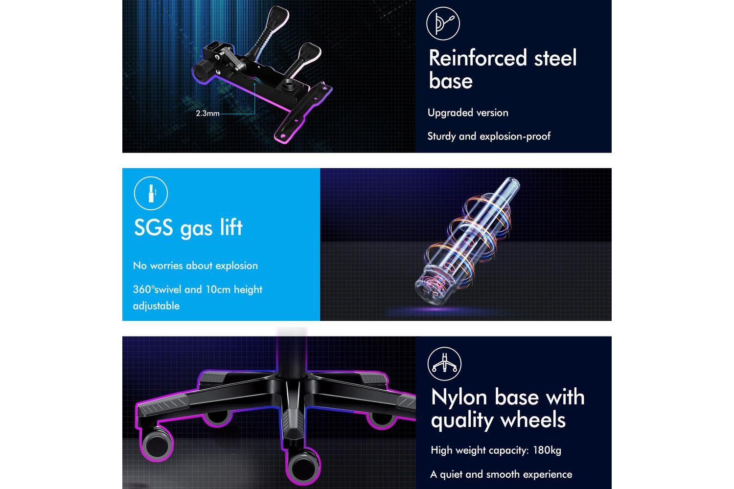 Built to last, the Alfordson Gaming Chair boasts a triple-layer seat construction—combining premium PU leather, high-resilience foam, and a sturdy wooden board for superior weight distribution and support. The SGS-approved gas lift ensures safe and reliable height adjustment, supporting users up to 180kg. Deluxe PP plastic armrests with extra padding provide wide, supportive comfort for your arms during long hours at your desk or gaming setup.