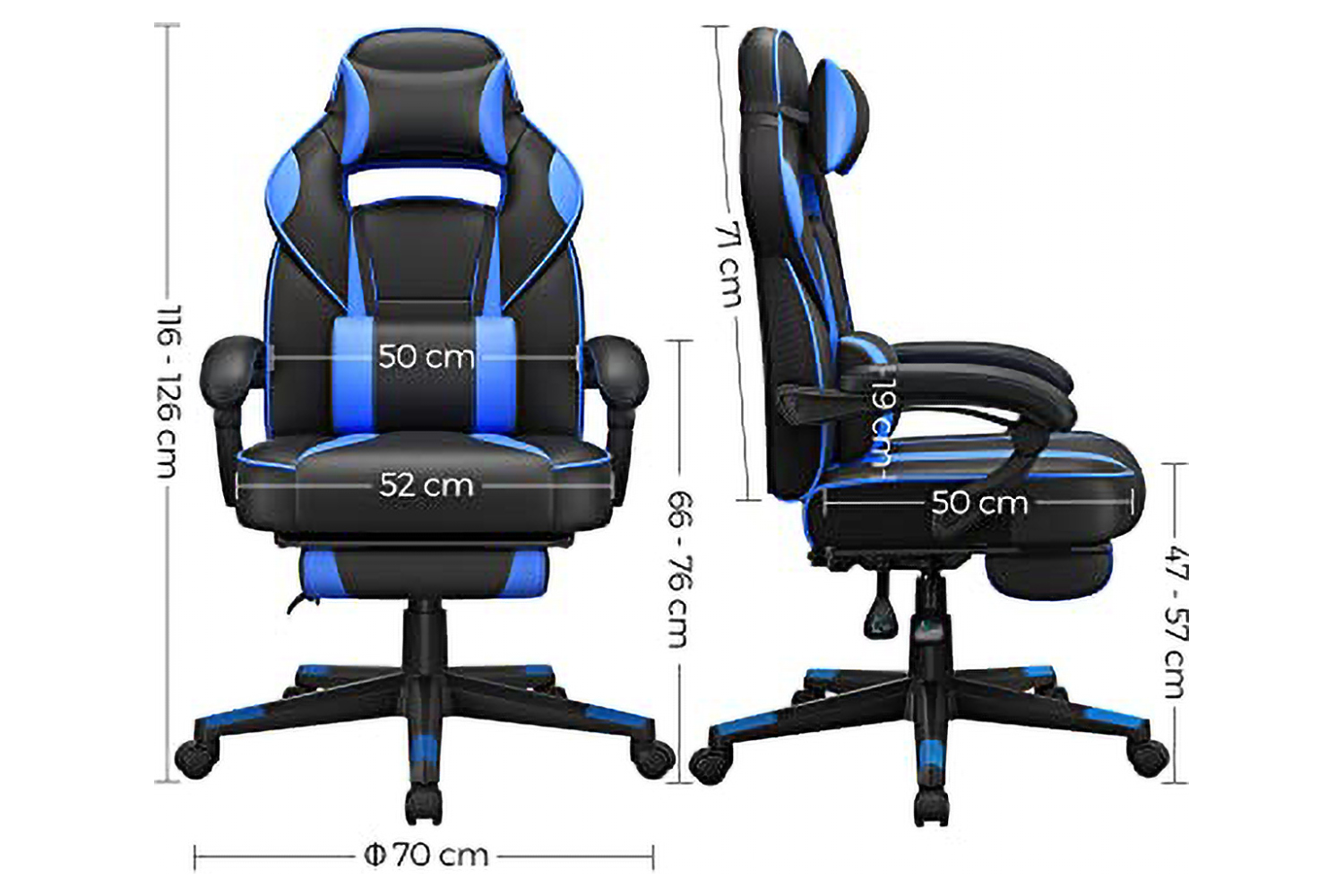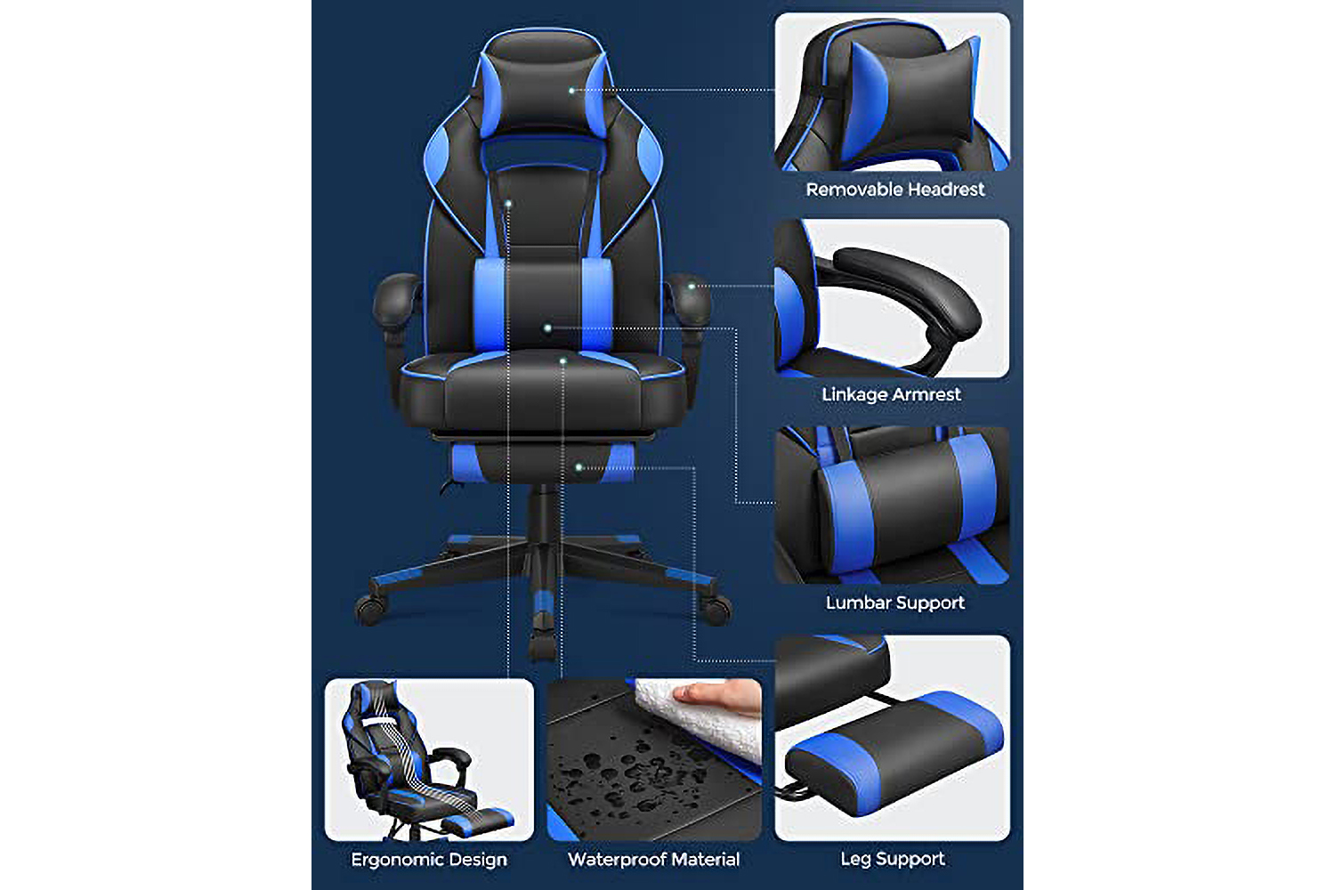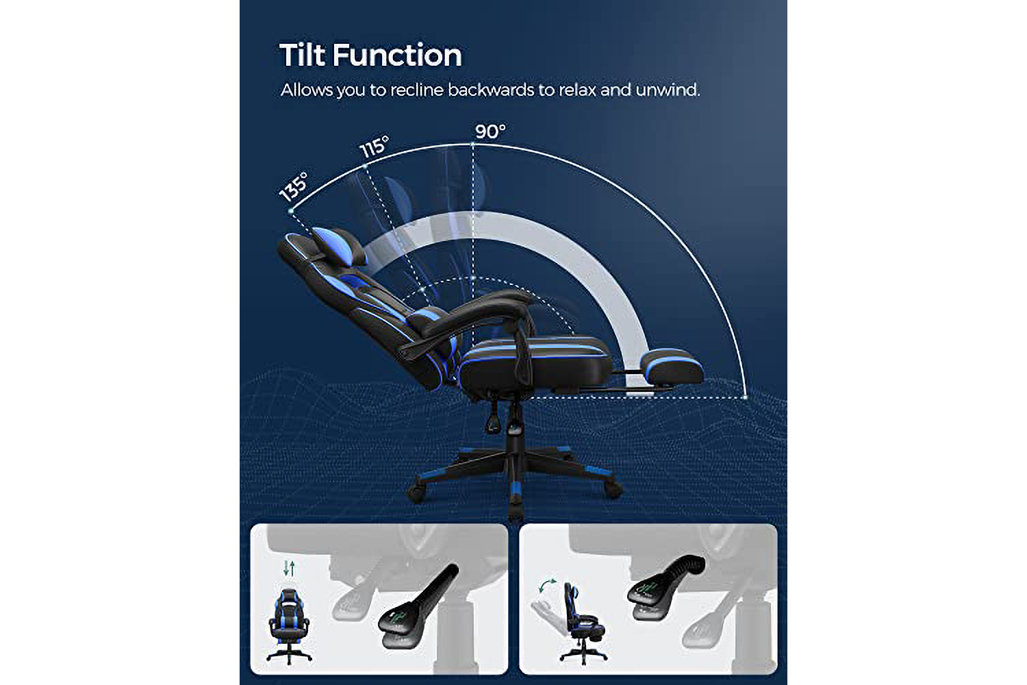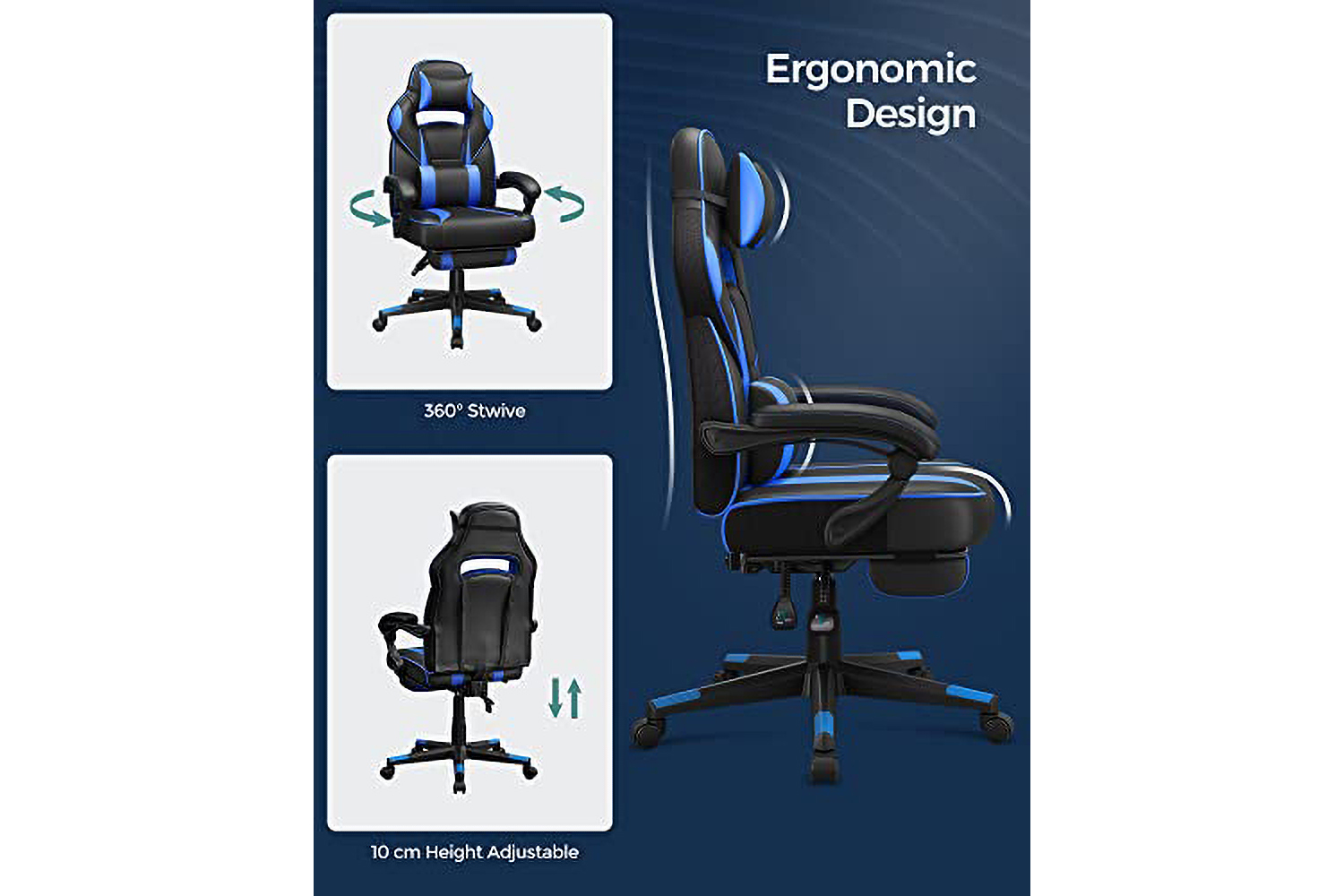 This back-adjustable gaming chair features a lumbar cushion, a footrest, a pillow and quiet wheels, so your body can relax when you concentrate - comfortable luxury for your study.