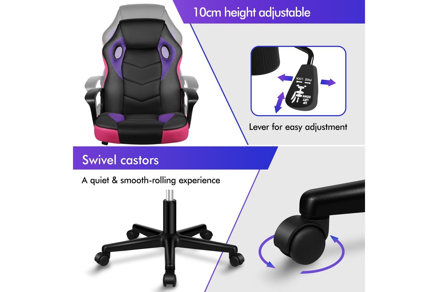 Safety and quality are at the heart of the Alfordson design. The chair is constructed from BIFMA-certified and Intertek-approved materials, ensuring long-lasting durability and peace of mind. Generous foam padding delivers plush comfort without compromise, and the stylish PP plastic armrests add a modern touch to any home office or gaming room. Available in a striking purple finish, this chair is sure to make a statement while seamlessly fitting into your décor.