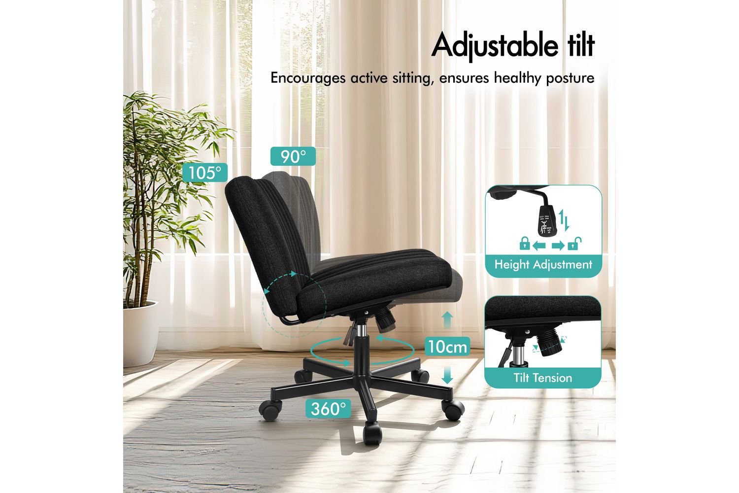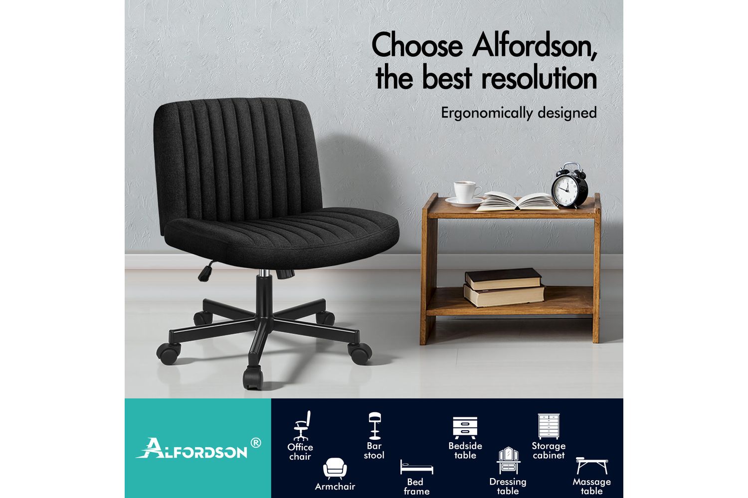 Crafted with deluxe linen fabric in a sleek black finish, the Alfordson chair offers a sophisticated look that complements any décor. The cross-legged, powder-coated chrome base not only adds a unique design element but also ensures stability and durability. The chair's mid-back, armless design is perfect for small spaces, allowing you to move freely and tuck the chair neatly under your desk when not in use. With its generous high-resilience foam padding and curved, ergonomic construction, you will enjoy superior lumbar support and comfort throughout your day.