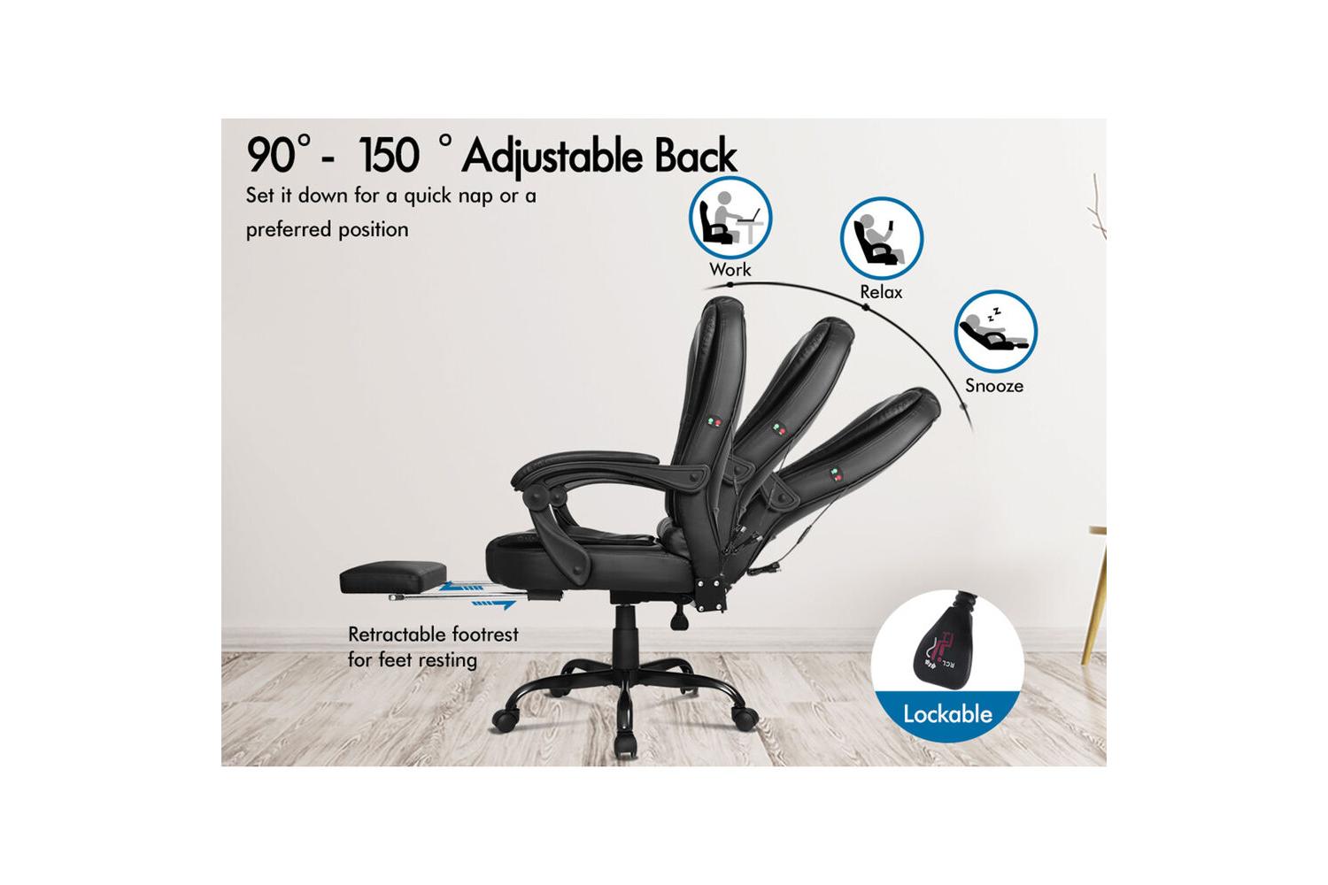 Perfect for long hours at your computer desk, the chair boasts a 150-degree recline adjustment, allowing you to find your ideal position for work, relaxation, or a quick power nap. The extendable footrest adds another layer of comfort, making it easy to put your feet up and unwind. With a 360-degree swivel and smooth-rolling, TUV-approved caster wheels, you can move freely and efficiently around your workspace.