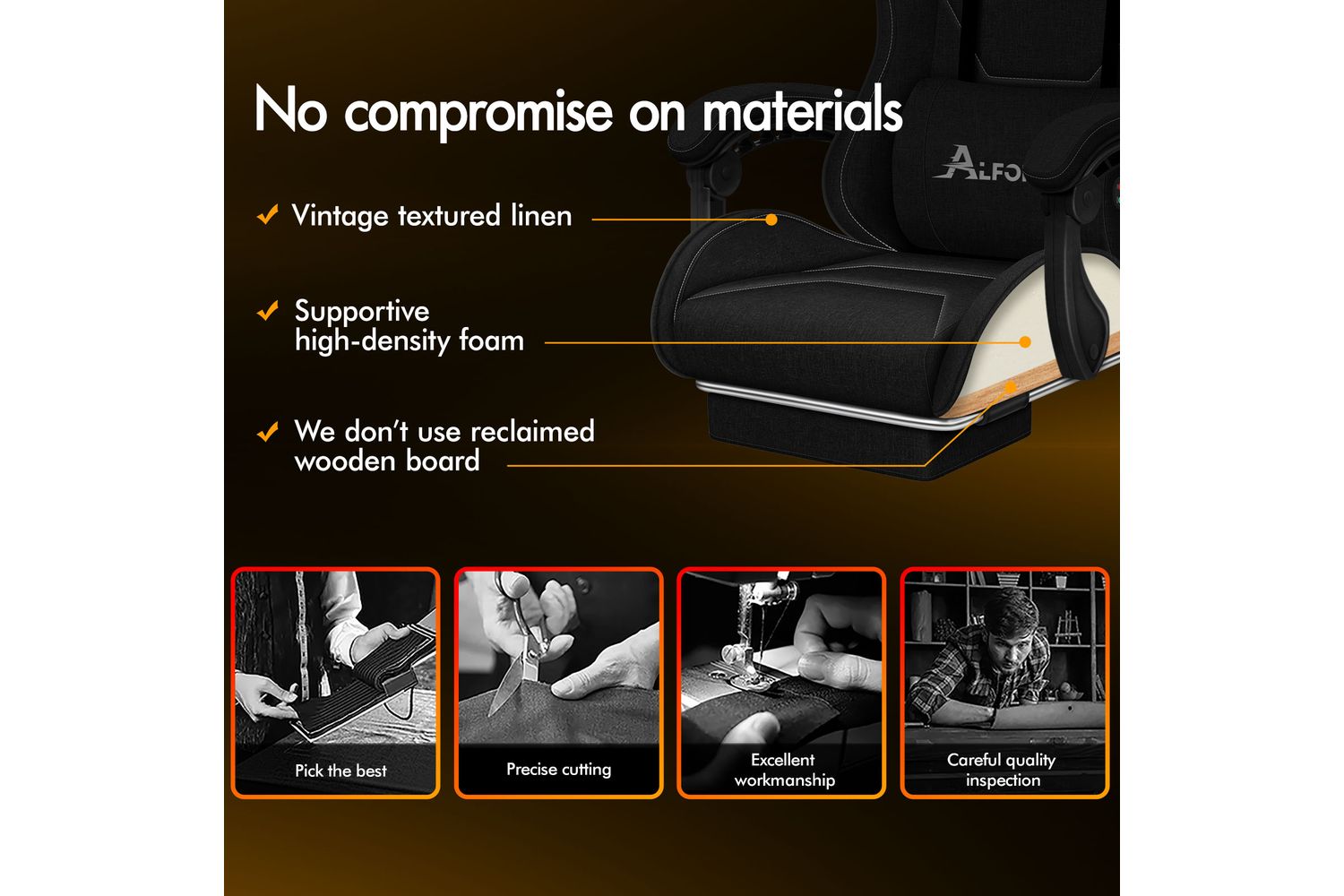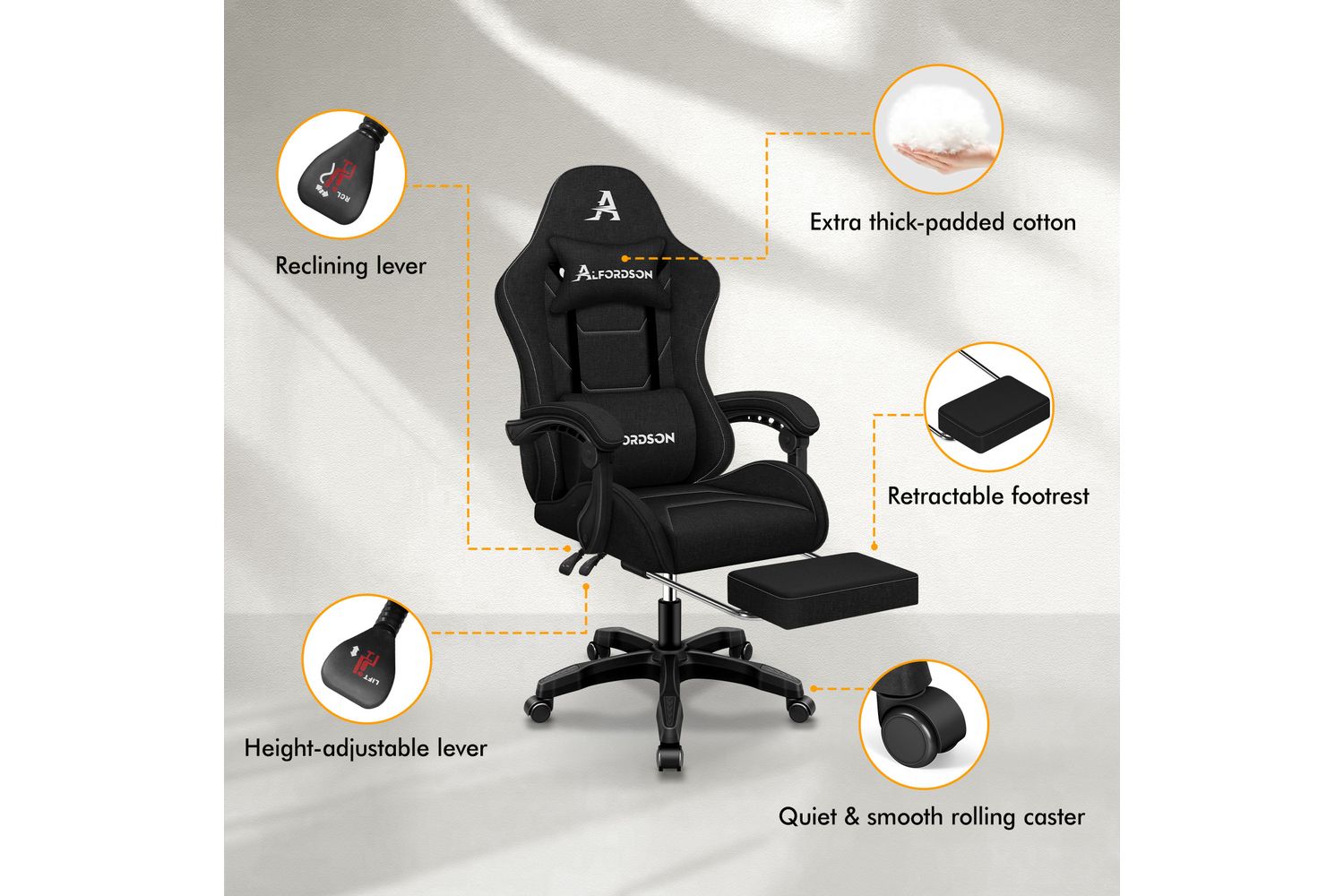 Engineered with an all-metal frame and a robust, certified base, the Alfordson Gaming Chair stands out for its strength and stability. The Intertek-approved linen fabric upholstery not only adds a touch of sophistication but also ensures breathability and easy maintenance, making it ideal for long hours of use. The triple-layer seat construction—combining premium linen, resilience foam, and steel—offers exceptional comfort and support, even during marathon gaming sessions or extended workdays.
