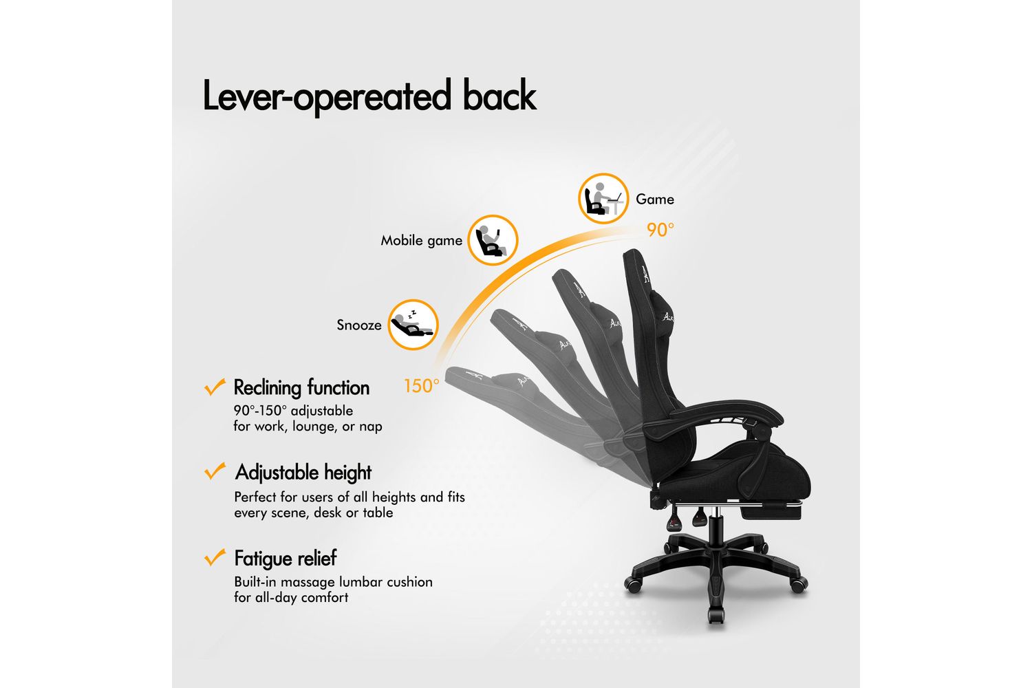 Enjoy the freedom to customise your seating experience with a 150-degree back recline adjustment and a 360-degree swivel. The chair features a retractable padded footrest, perfect for relaxing between tasks or immersing yourself in your favourite games. The detachable and height-adjustable lumbar and neck cushions provide targeted support, helping to reduce fatigue and promote healthy posture. For added luxury, the built-in massage lumbar cushion soothes your lower back, making this chair a standout choice for anyone seeking relief from daily stress.