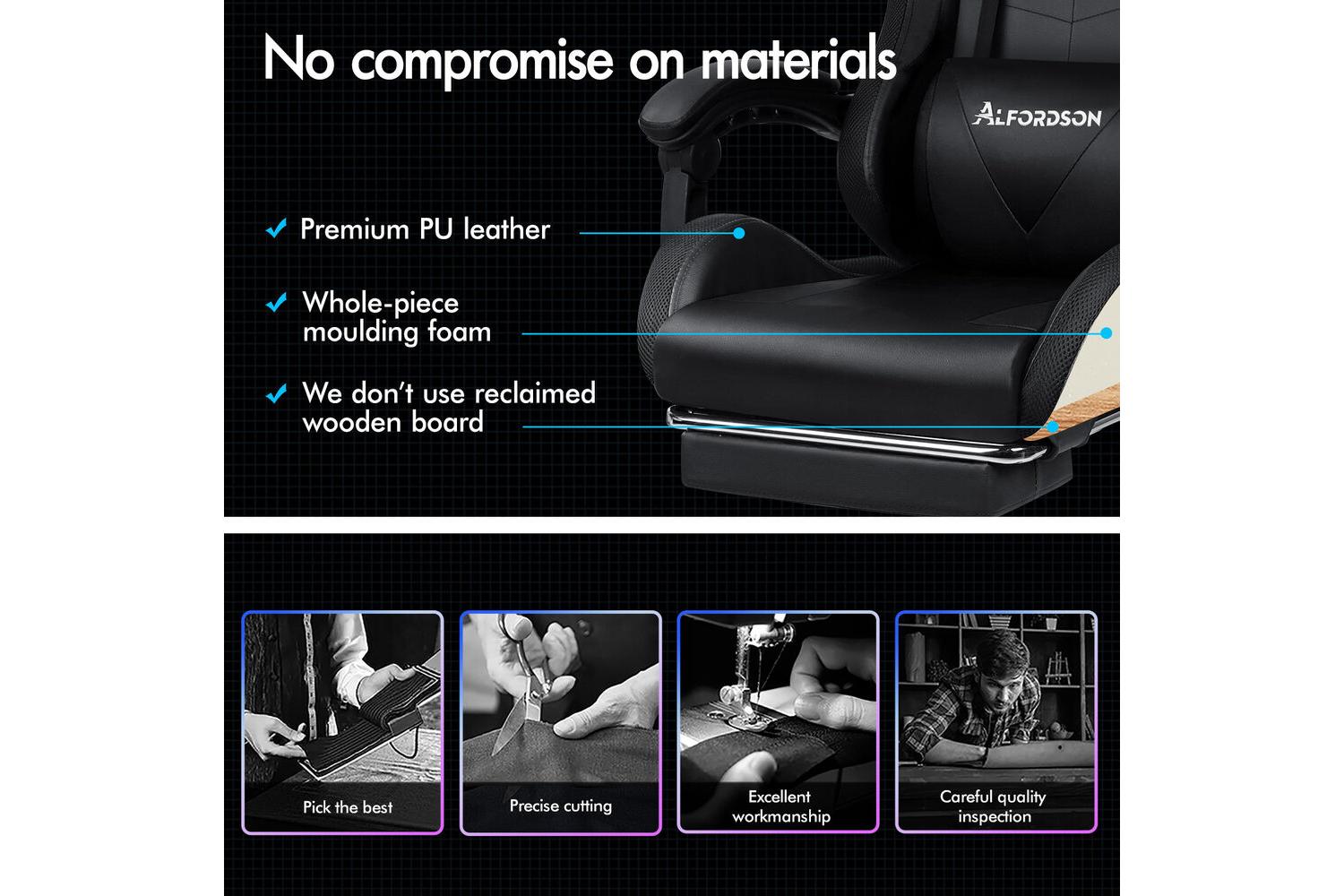 Crafted with a robust all-metal frame and a stylish chrome base, the Alfordson Gaming Massage Chair stands out for its durability and stability. The certified caster wheels glide smoothly across any surface, while the Intertek approved premium PU leather upholstery ensures long-lasting comfort and easy maintenance. The chair's triple-layer seat construction—featuring PU leather, resilience foam, and steel—provides exceptional support, even during marathon gaming sessions or extended workdays.