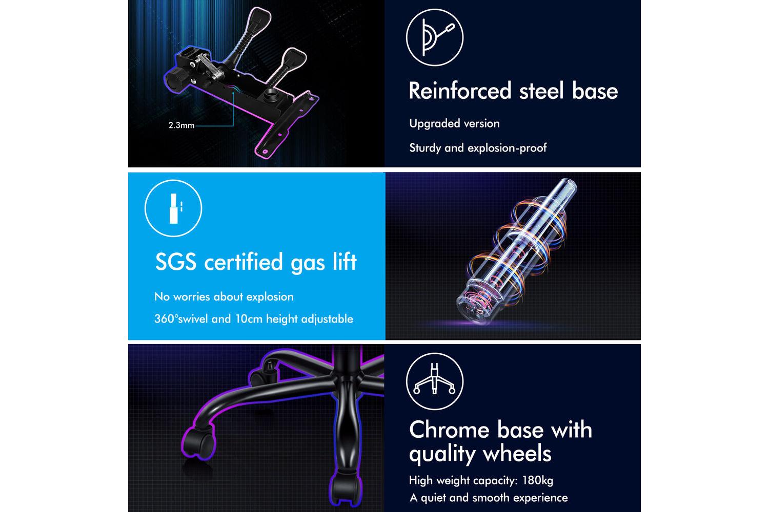 Take your gaming experience to the next level with the built-in LED lighting system. Choose from two static colour options, 10 speed settings, 366 mode switches, and 32 brightness levels to create the perfect atmosphere for every session. The chair's high weight capacity of 180kg ensures it is suitable for a wide range of users, while the SGS approved gas-lift system offers smooth and reliable height adjustments.