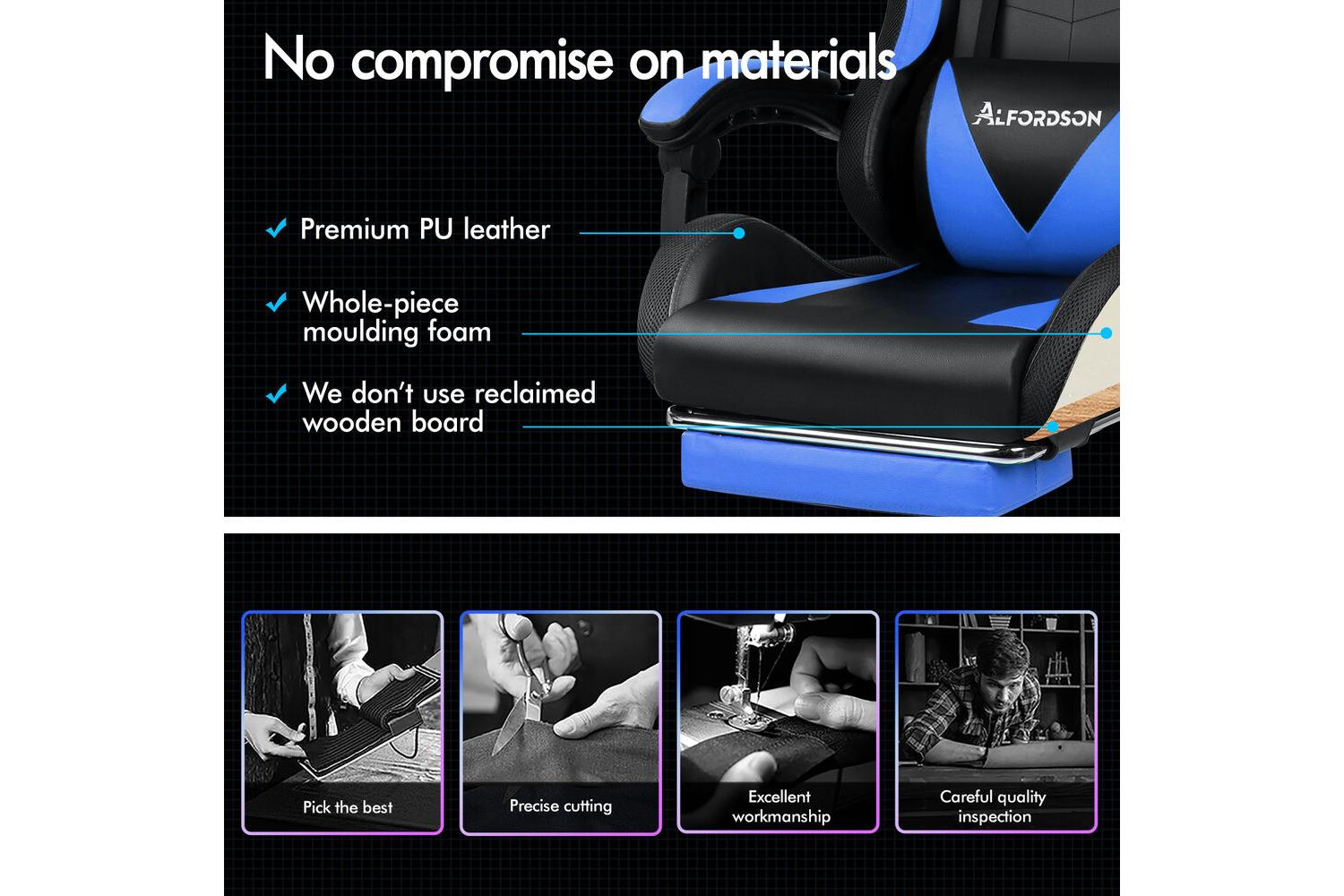 Crafted with a robust all-metal frame and a stylish chrome base, the Alfordson Gaming Massage Chair stands out for its durability and stability. The certified caster wheels glide smoothly across any surface, while the Intertek-approved premium PU leather upholstery offers a soft, easy-to-clean finish that resists wear and tear. The triple-layer seat construction—featuring PU leather, resilience foam, and steel—ensures long-lasting comfort and support, even during marathon gaming sessions or extended workdays.