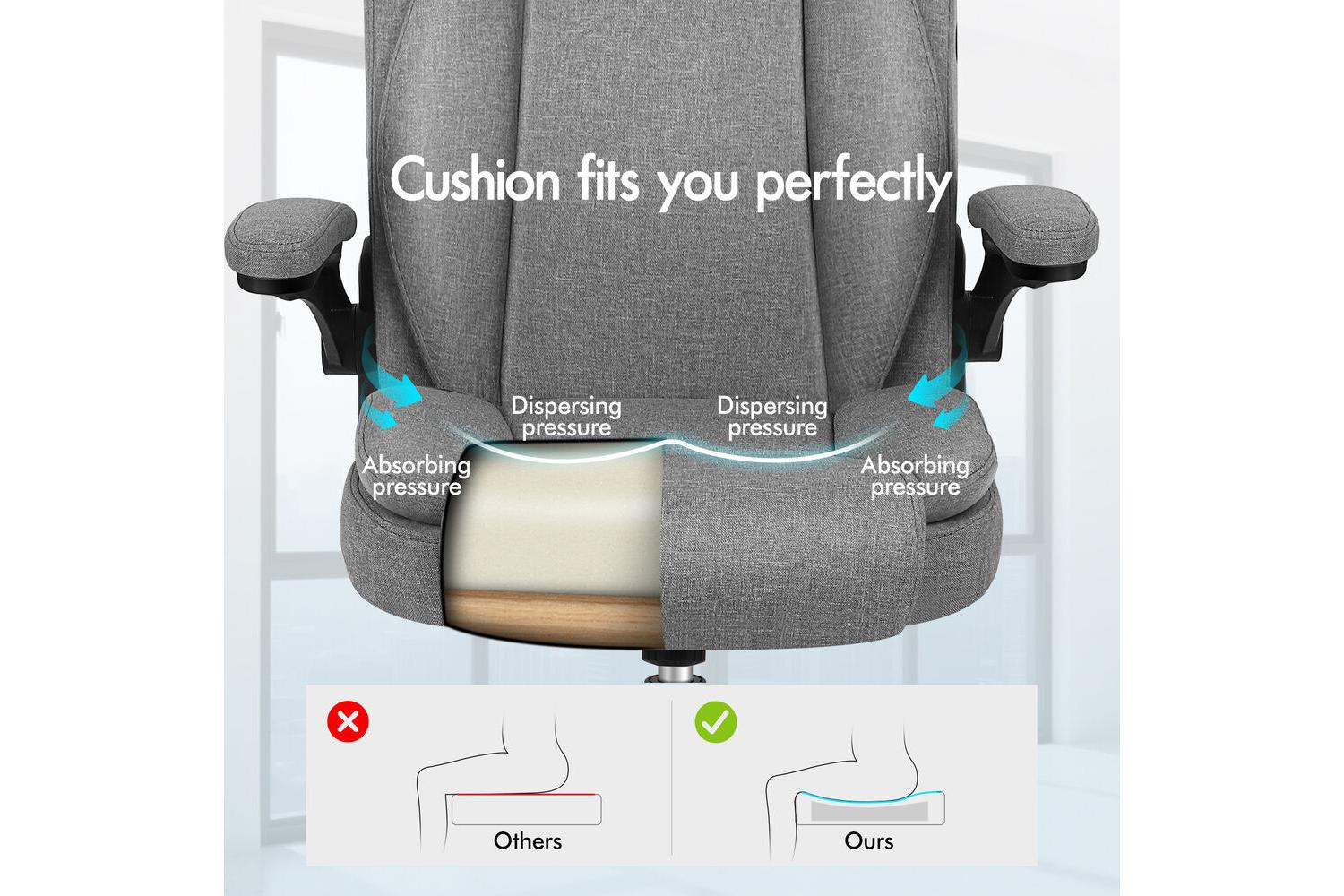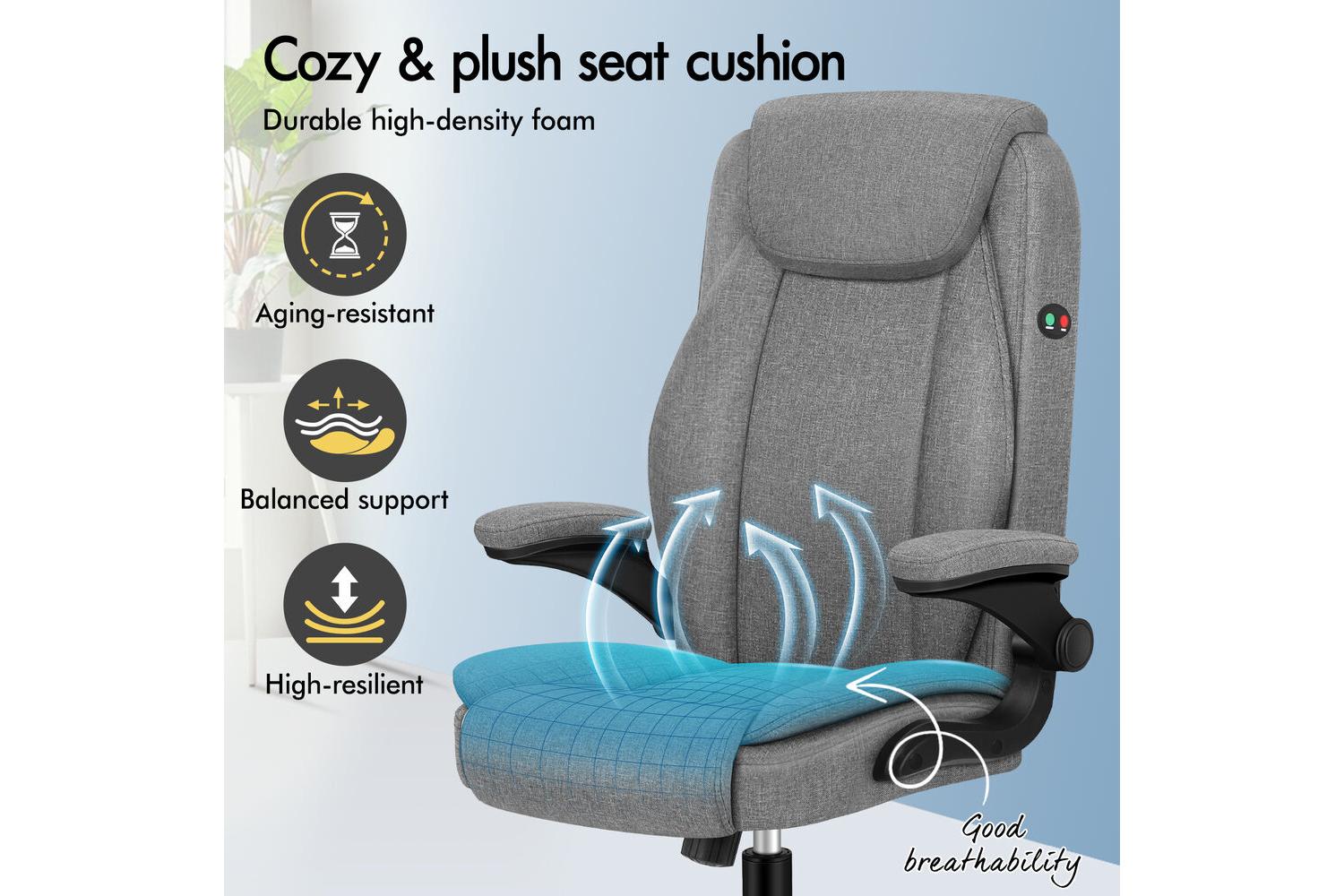 Crafted with a triple-layer seat of linen fabric, resilience foam, and a sturdy wooden board, this chair is built to last. The chrome base and TUV-approved caster wheels provide stability and smooth mobility, while the SGS-approved gas lift ensures easy height adjustment. The chic grey fabric not only looks great but is also breathable, keeping you cool and comfortable all year round.