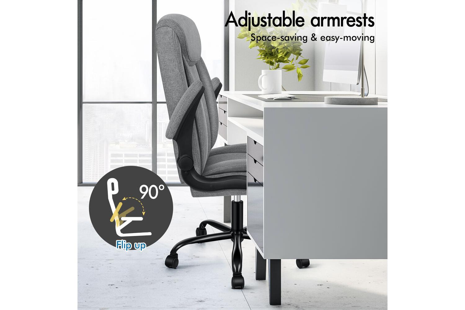 The high back design and S-curve backrest of the ALFORDSON chair contour perfectly to your body, providing full support from your head to your lower back. The padded seat and backrest, enhanced with high-resiliency foam, ensure you stay comfortable throughout the day. Flip-up armrests and smooth 360° swivel casters make movement effortless, while the flexible tilt adjustment lets you find your ideal seating position with ease.