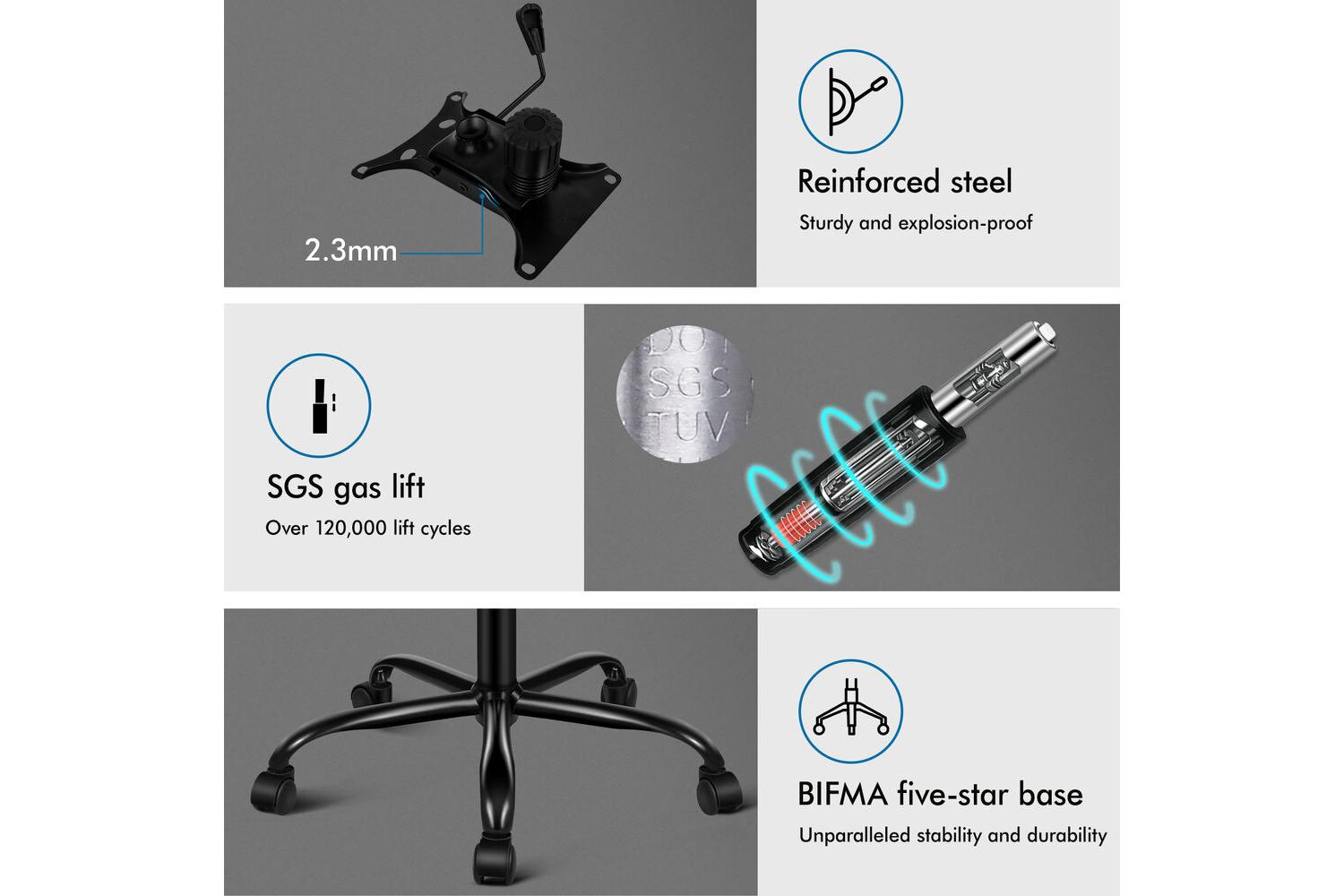 - Sturdy chrome base and SGS-approved gas lift