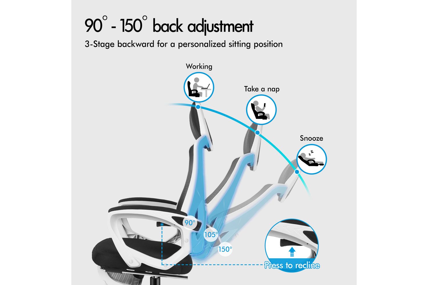 - 3-position backrest and up to 150-degree recline