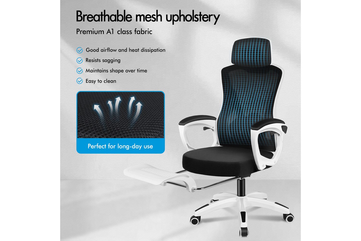 - Breathable mesh back and fabric seat for all-day comfort