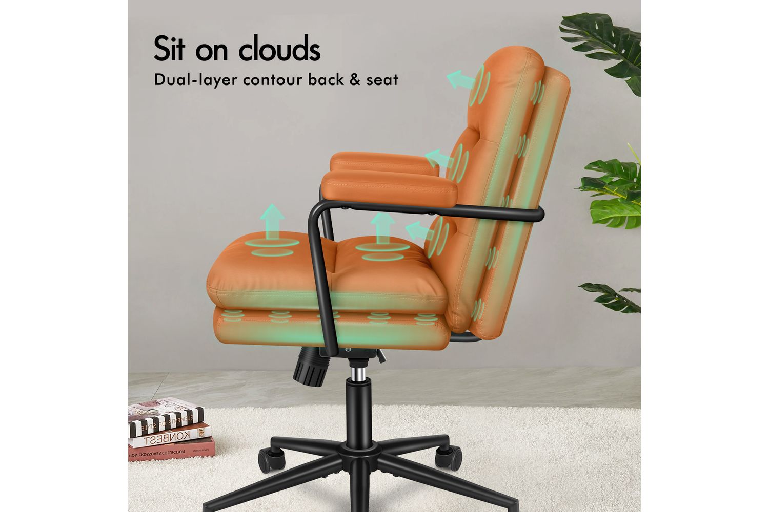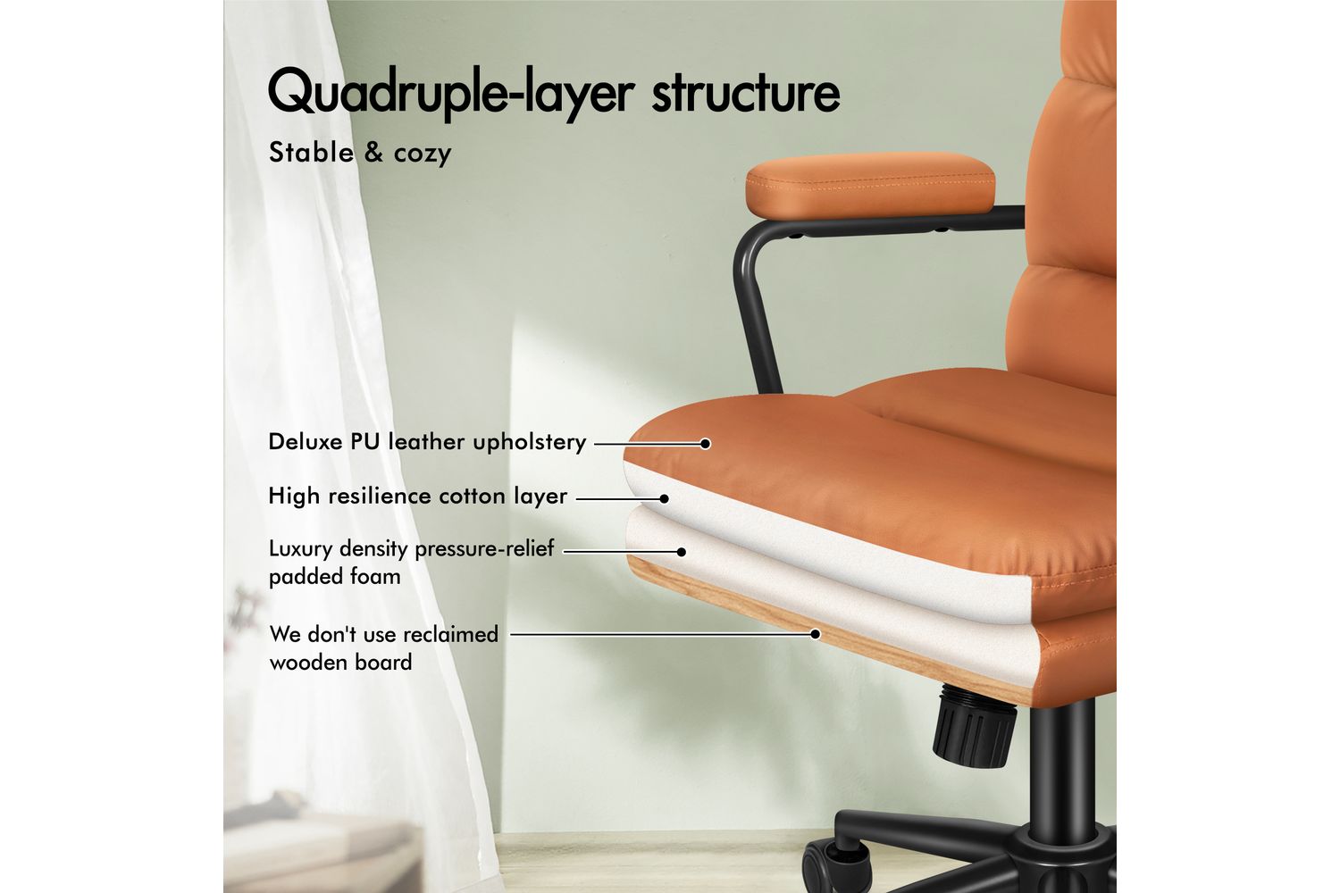 Experience all-day comfort with generous high-resilience dual-layer foam padding on both the back and seat. The ergonomic flared armrests are wide, soft-padded, and supportive, allowing you to sit comfortably whether you are working, studying, or relaxing. The premium faux leather upholstery in a rich brown finish not only looks sophisticated but is also soft to the touch and easy to maintain, making it a practical addition to any home office or living space.