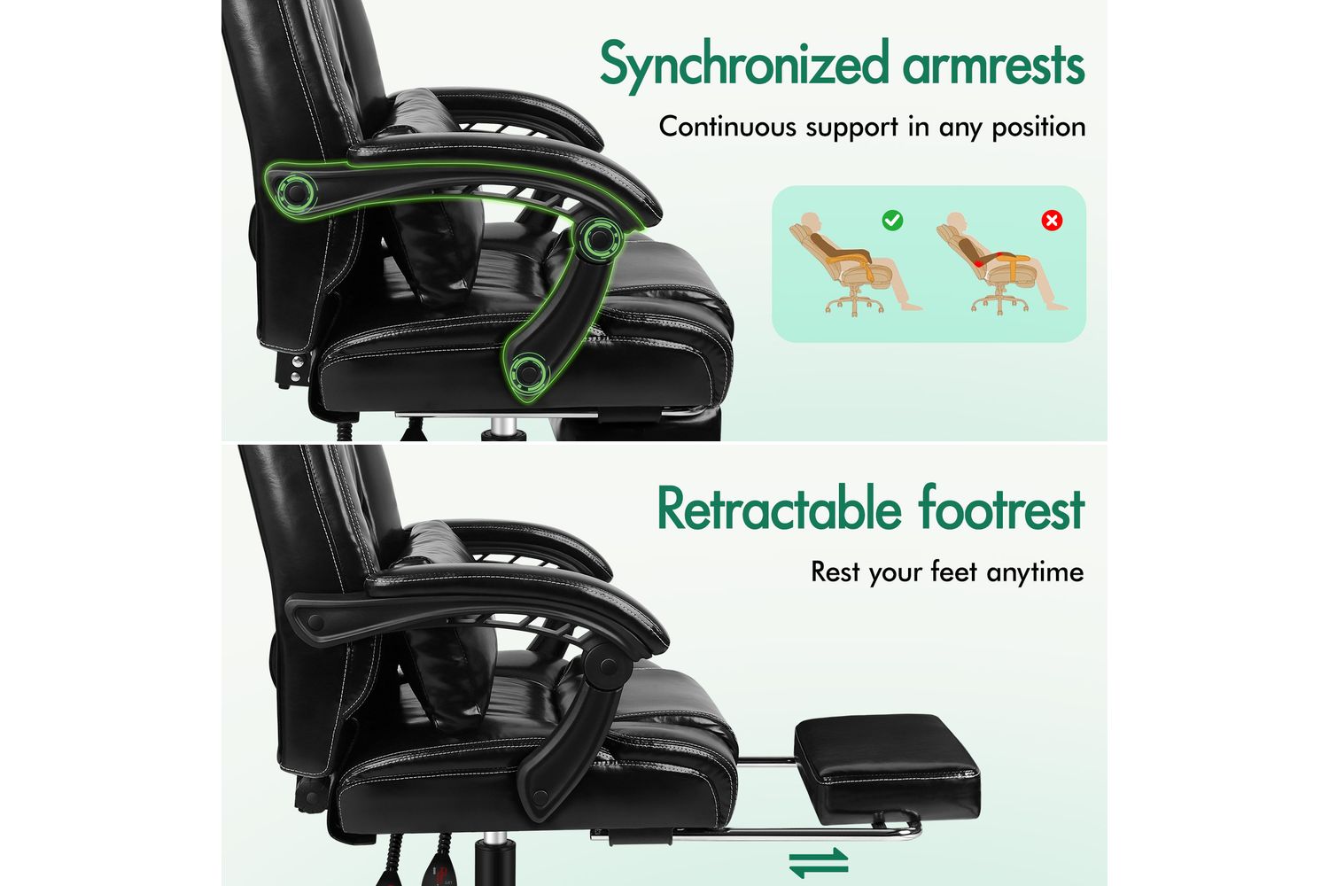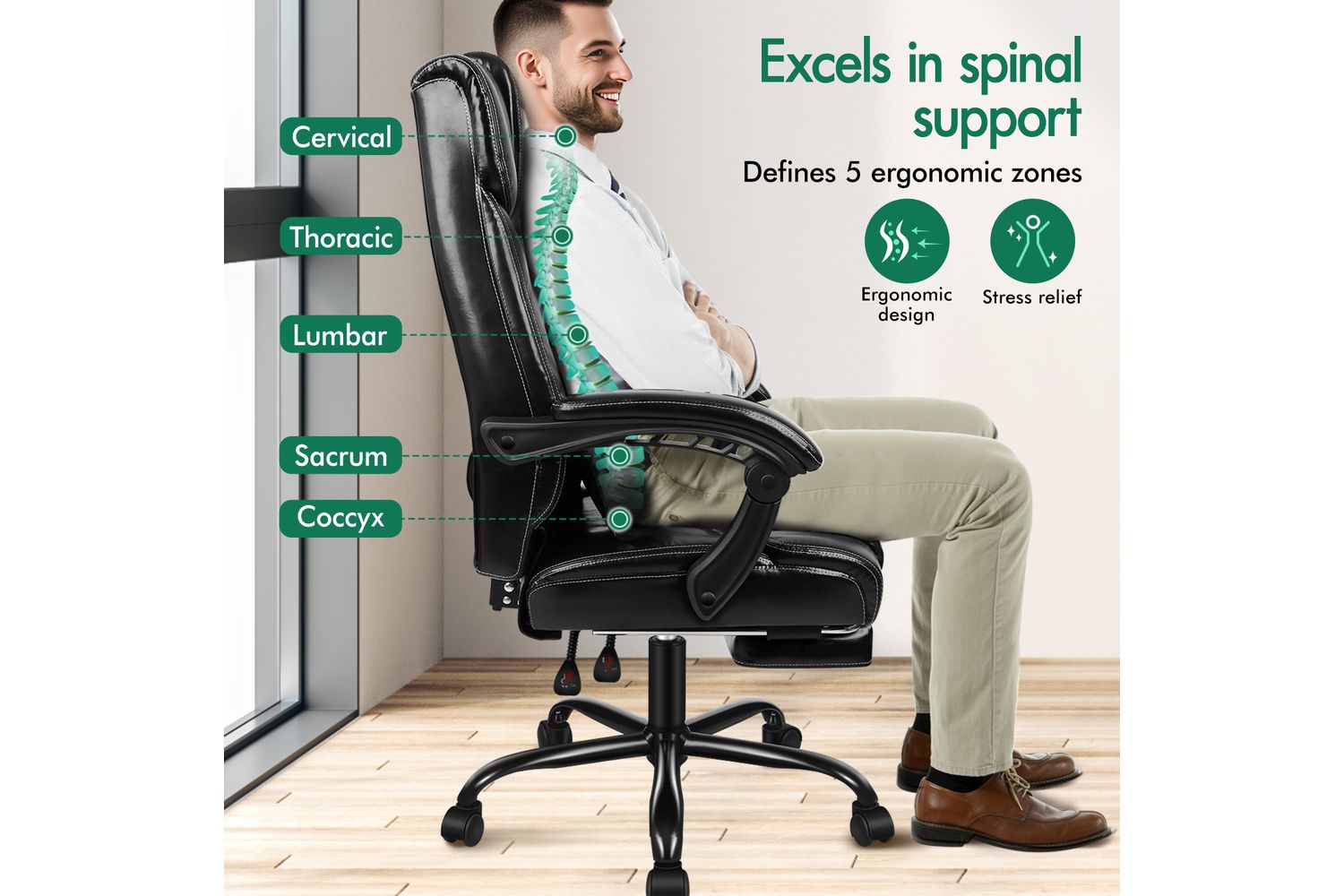 Engineered for all-day support, the ELFORDSON chair features a dual-layer high back design and an extra-large, adjustable lumbar cushion that contours perfectly to your body. The ergonomic structure helps eliminate back and shoulder pressure, making it ideal for long hours at your desk. With a 150-degree back recline and a retractable padded footrest, you can easily switch from focused work to relaxing breaks. The chair's smooth 360-degree swivel and premium universal wheels allow for effortless movement, while the deluxe padded armrests provide wide, supportive comfort.