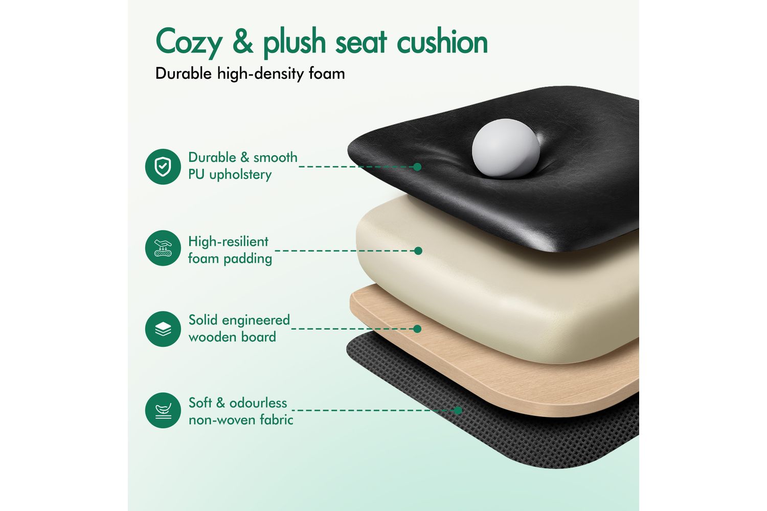 - Seat: Triple-layer (PU leather, resilience foam, wooden board)