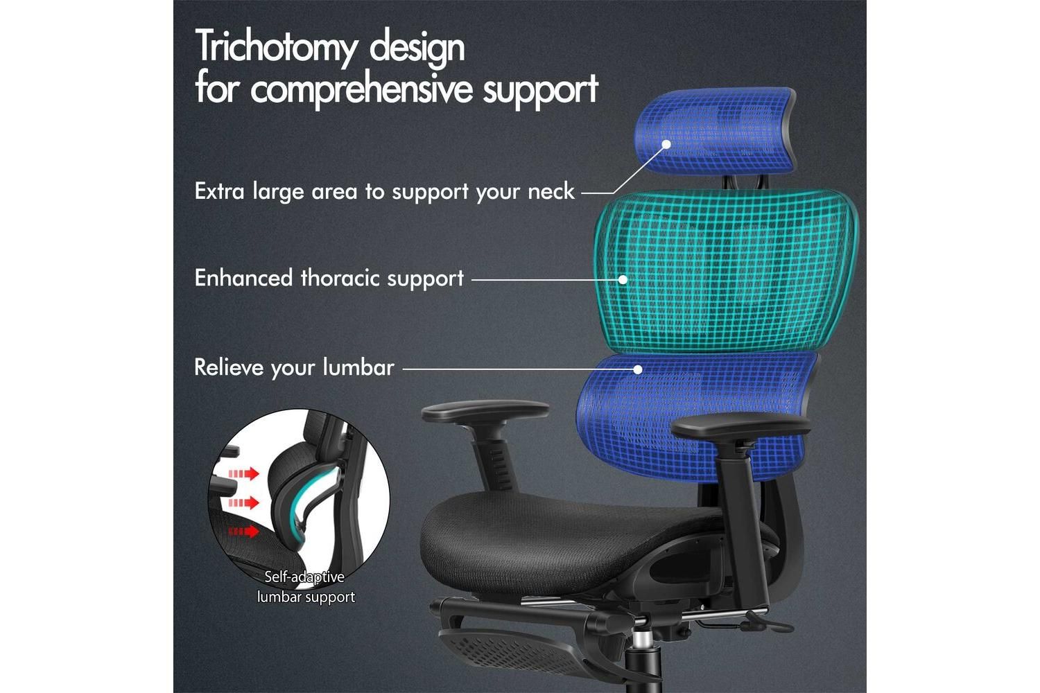 - Ergonomic S-curve design with self-adaptive lumbar support