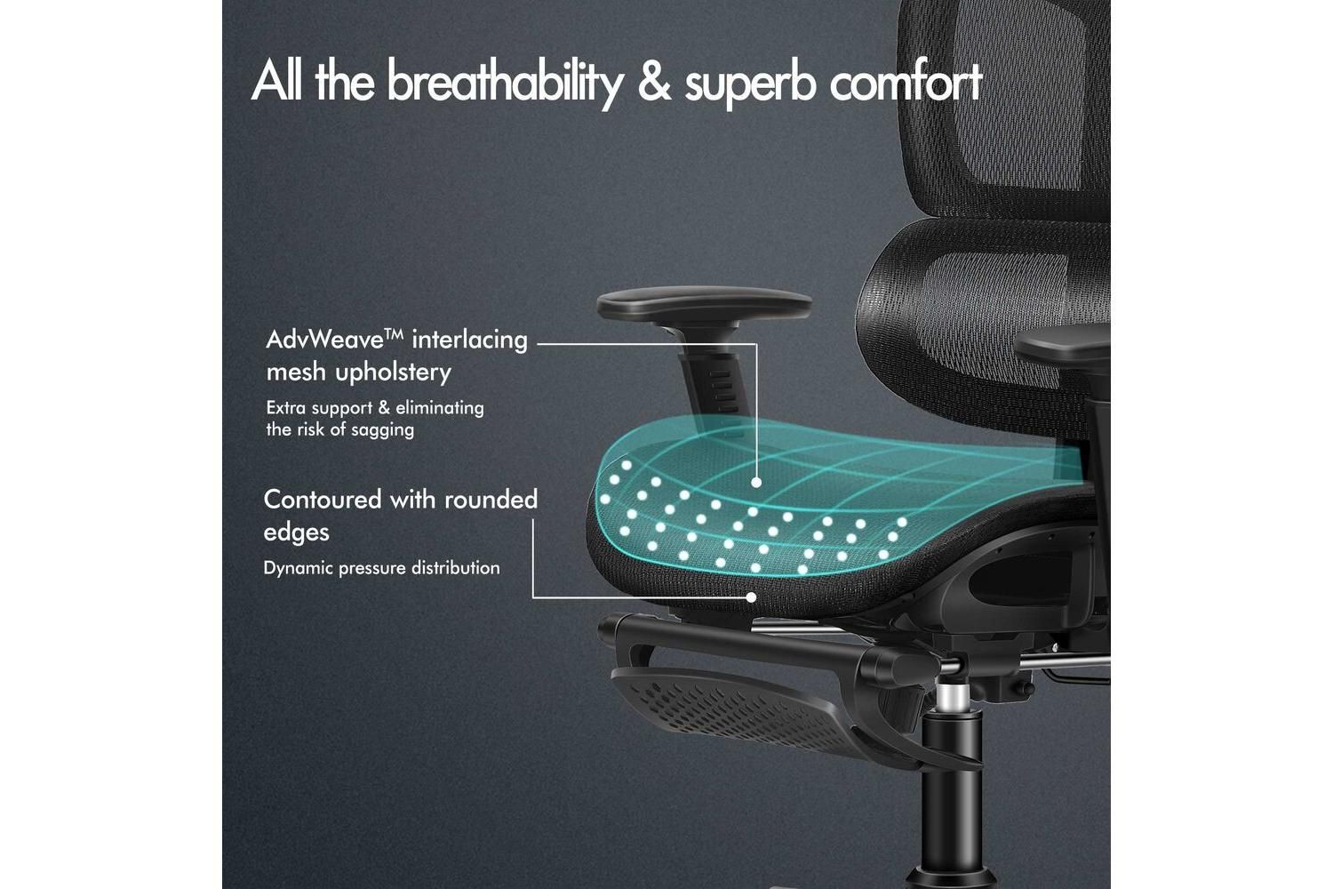 Experience the difference with the advanced S-curve design and self-adaptive lumbar support, which work together to eliminate lumbar pressure and provide comprehensive back support. The high-tensile AdvWeave mesh upholstery is not only highly breathable but also long-lasting, keeping you cool and comfortable even during long hours at your desk. With a robust load capacity of up to 180 kg, this chair is built to accommodate a wide range of users, offering both strength and stability.