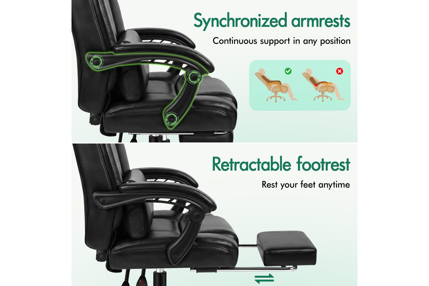 Enjoy the flexibility of a 150-degree reclining function, perfect for taking a break or finding your ideal working angle. The chair features a retractable padded footrest, letting you stretch out and relax whenever you need. With smooth 360-degree swivel action and premium universal wheels, you can move effortlessly around your workspace. The deluxe PP plastic armrests are wide, supportive, and padded for extra comfort, making this chair suitable for both adults and children.