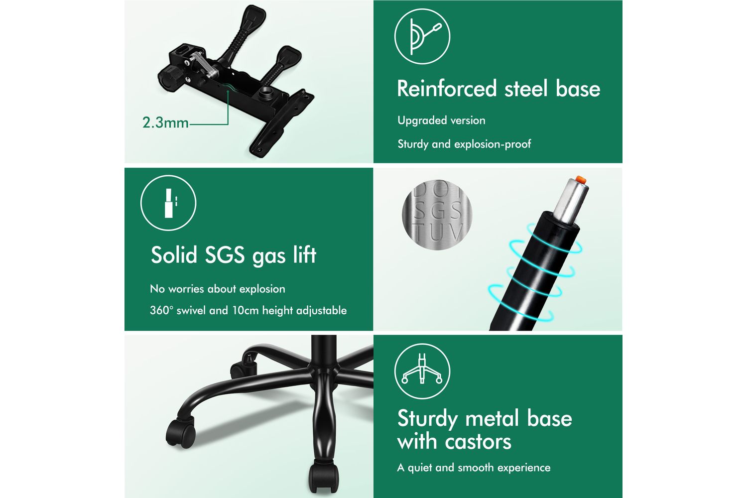 Built to last, the Alfordson Office Chair boasts a high weight capacity of 180kg and is constructed with a triple-layer seat of PU leather, resilience foam, and a sturdy wooden board. The black powder-coated chrome base is not only stylish but also resistant to dirt, ensuring your chair looks pristine in any setting. Safety is paramount, with Intertek-approved supreme PU leather, SGS-approved gas-lift, and TUV-approved caster wheels for peace of mind.