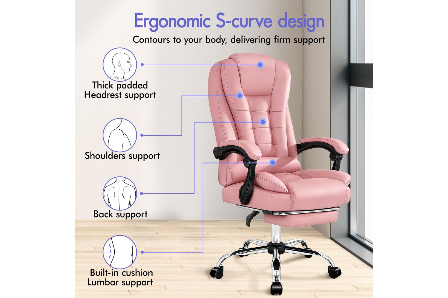 The ergonomic S-curve design contours perfectly to your body, providing essential support for your back and shoulders. Generous foam padding, a dual-layer butterfly design, and double-stitched upholstery ensure lasting comfort and durability. The chair features a sturdy chrome base, TUV certified casters, and an SGS approved gas-lift system, giving you peace of mind and smooth mobility on any surface.