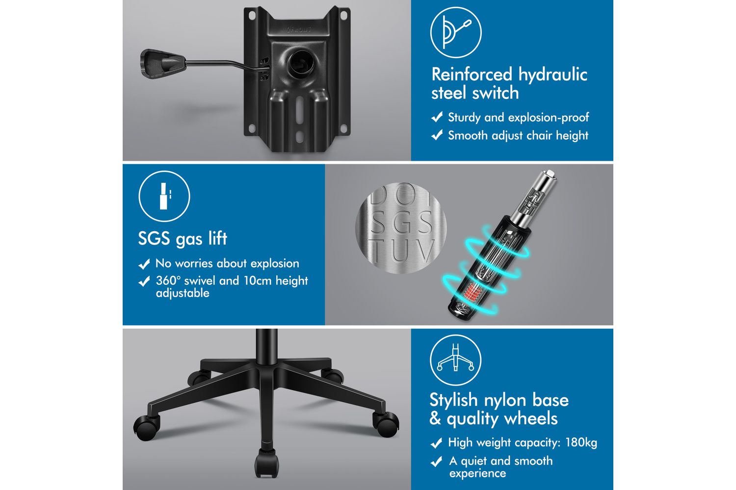 Whether you are working from home, gaming, or handling business tasks, the Alfordson Office Chair delivers a smooth, supportive experience. The heavy-duty metal and PP construction ensures durability, while the premium universal wheels and steady nylon base provide effortless 360-degree swivel and mobility. With a maximum weight capacity of 180kg and rigorous safety certifications, you can trust this chair to support you day in, day out.
