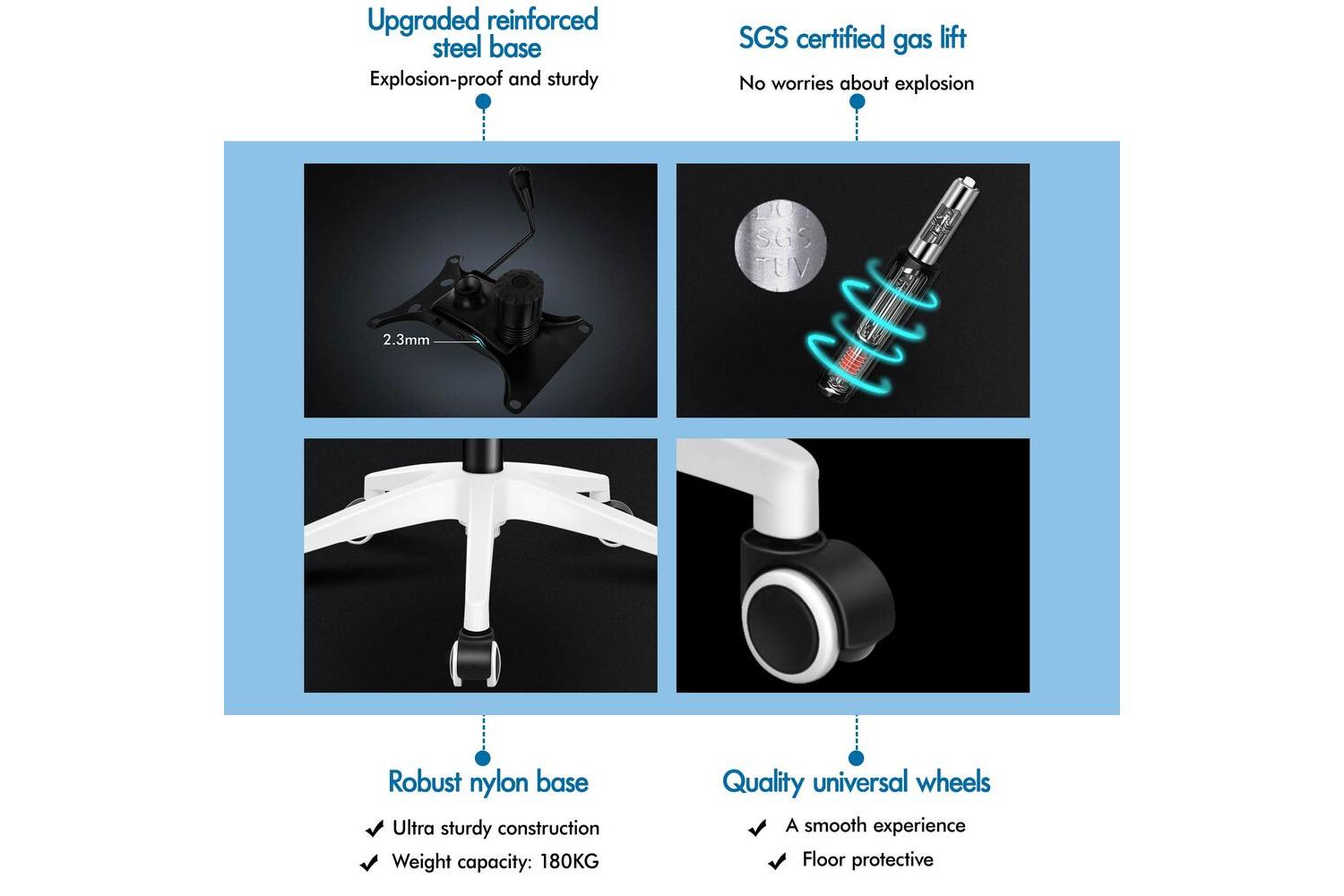ALFORDSON takes pride in using only premium materials—no recycled foams, no shortcuts on padding, and no compromises on quality. The triple-layer seat combines mesh fabric, resilience foam, and a sturdy wooden board for superior comfort and support. The flexible tilt adjustment and 360-degree swivel function let you find your perfect position, whether you are working, gaming, or taking a well-deserved break.