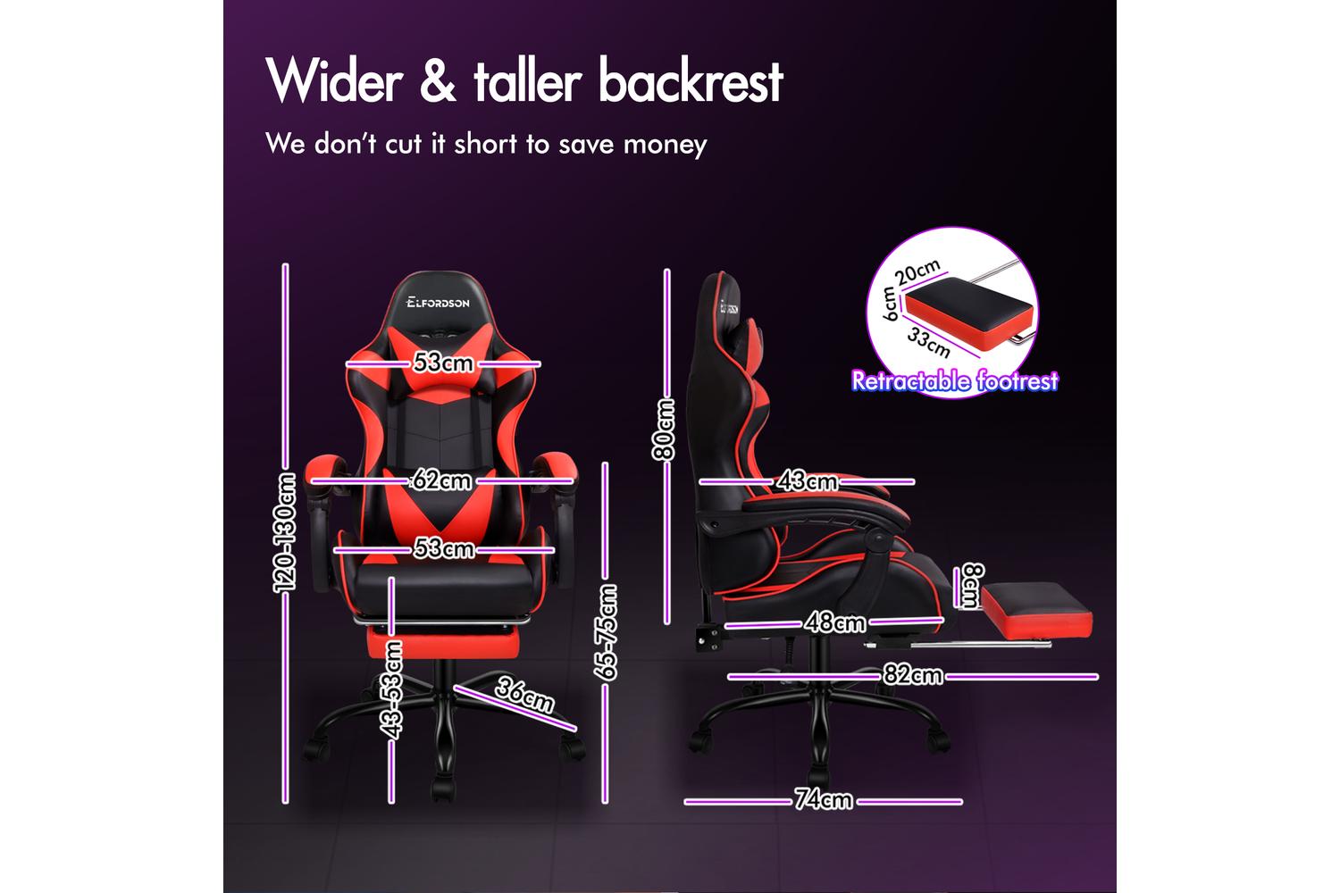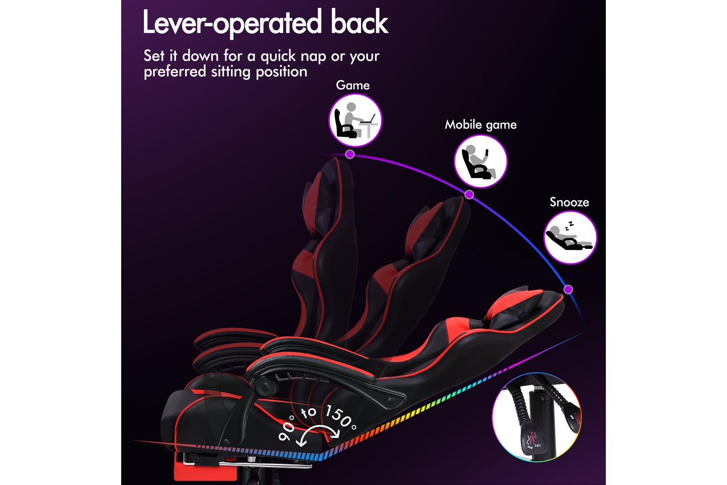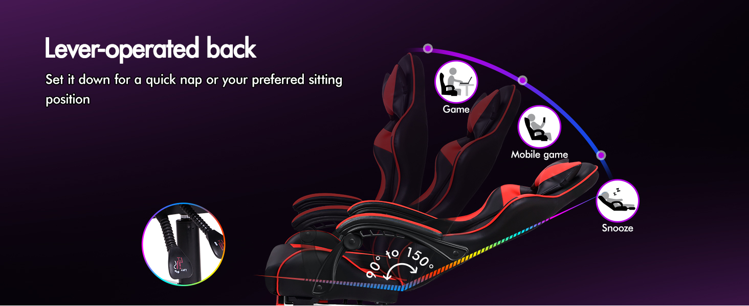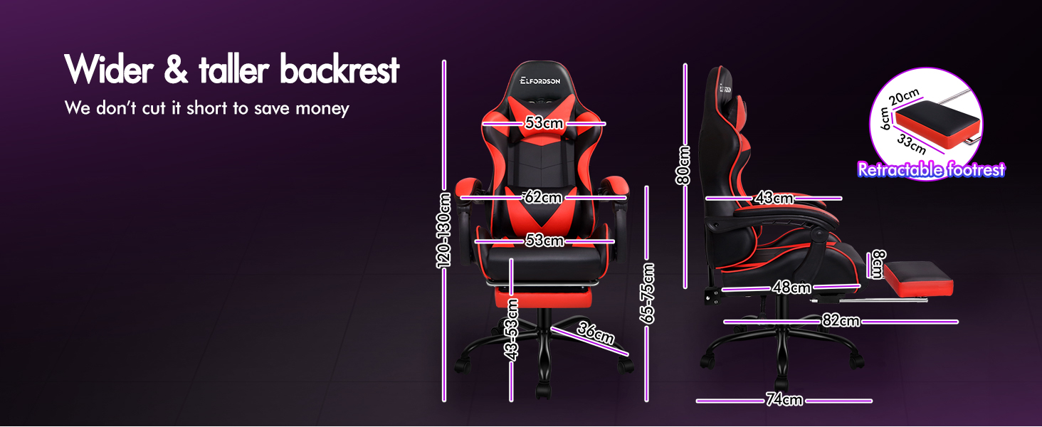 With backrest recliner between 90° and 150°, retractable padded footrest, 10cm seat height adjustments, and 360° swivel castors, this chair fits comfortably under most gaming desks or workstations.