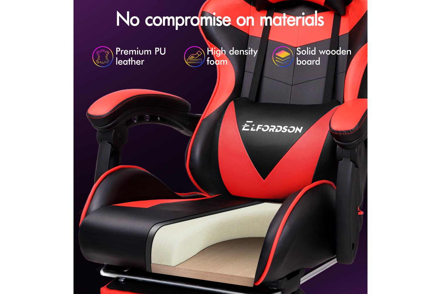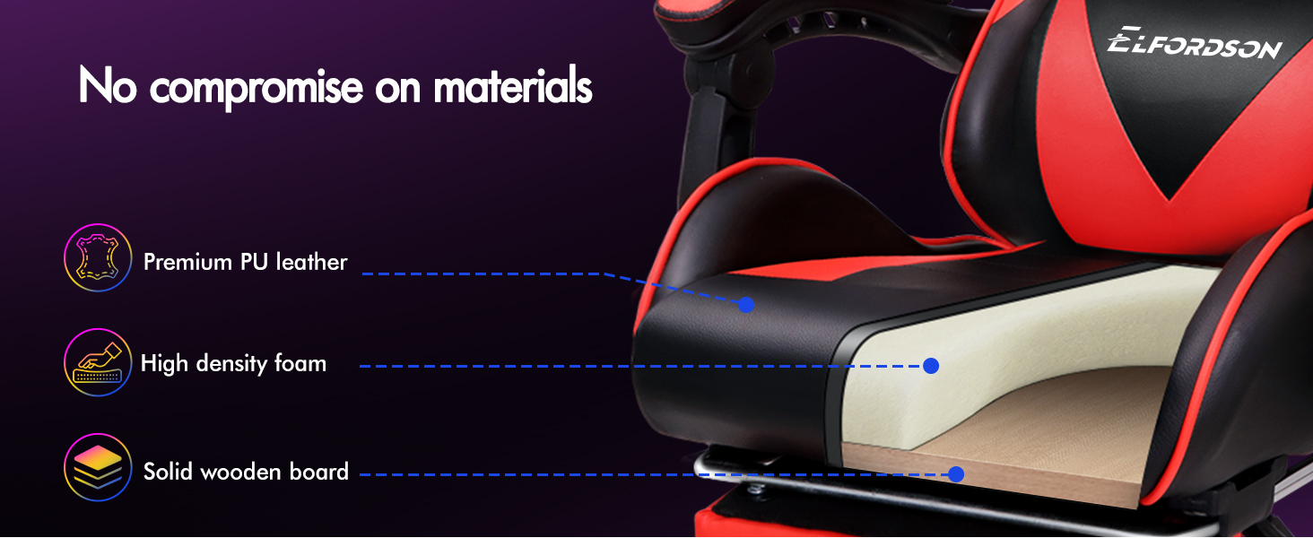 High-density foam padding on back and seat fully contours your body shape, built for all-day comfort. Adjustable and removable neck pillow, lumbar cushion adapts your sitting posture. 80cm high backrest ensures ultimate ease, even for those with a larger build.